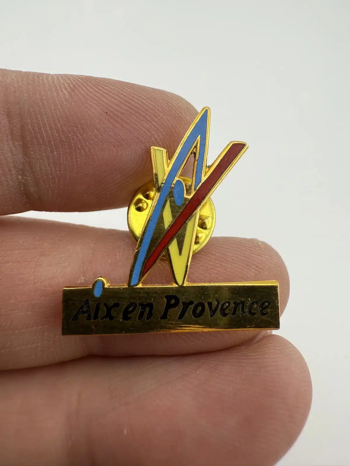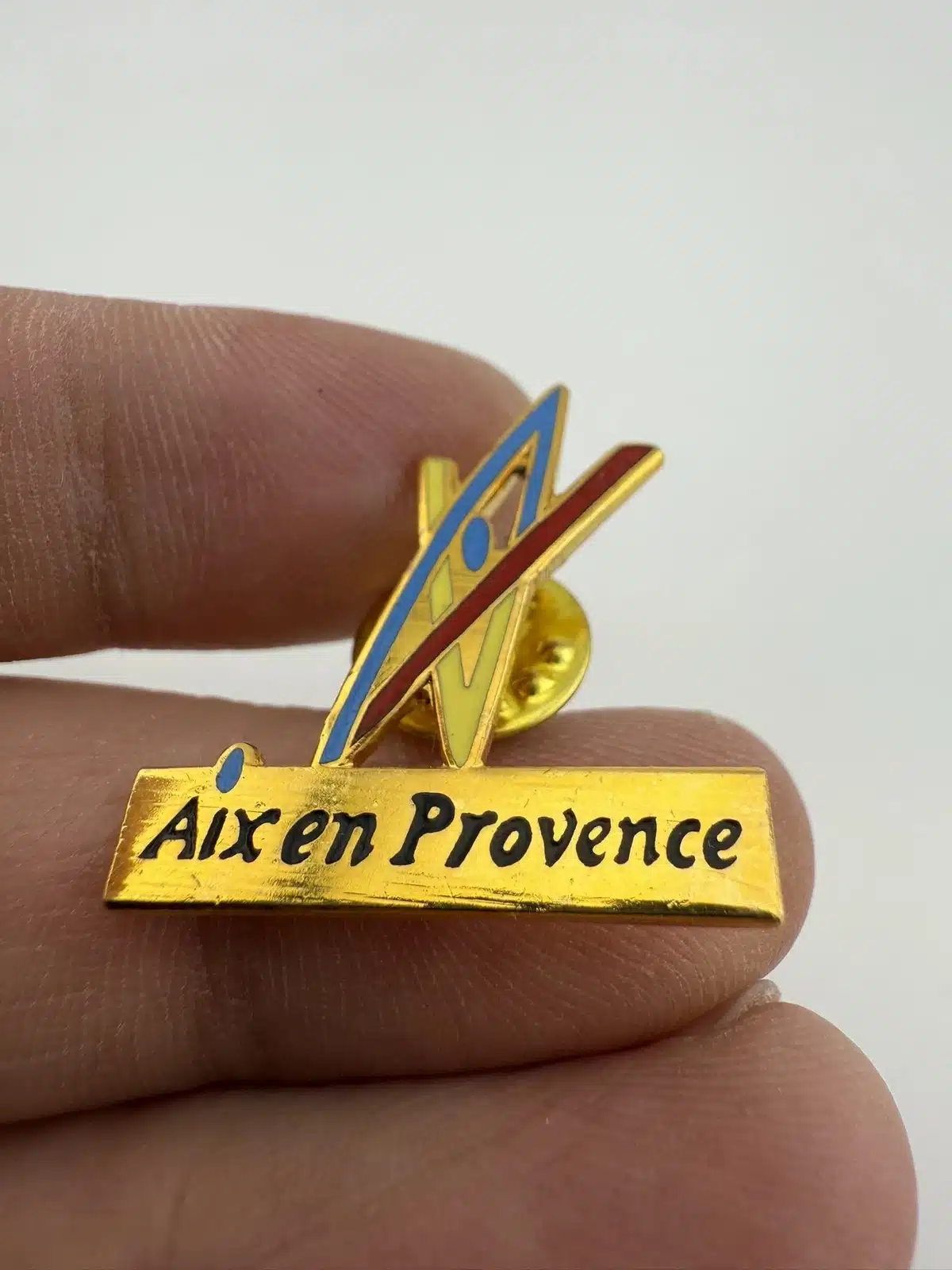 This Aix-en-Provence pin is gold tone, with black, red, blue and yellow enamel highlights. The logo on top appears to be a stylized AIX. Beautiful city in southern France.