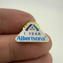 Issued by Albertsons, this pin recognizes one year of service for employees of the supermarket chain. It features the company’s logo as well as the words: 1 Year.