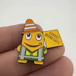 The Amazon Peccy Caught Being Safe Pin features a whimsical design of a character wearing an orange traffic cone as a hat, symbolizing safety in a playful manner.