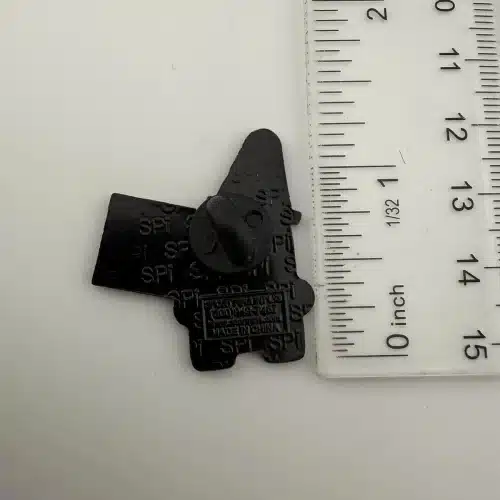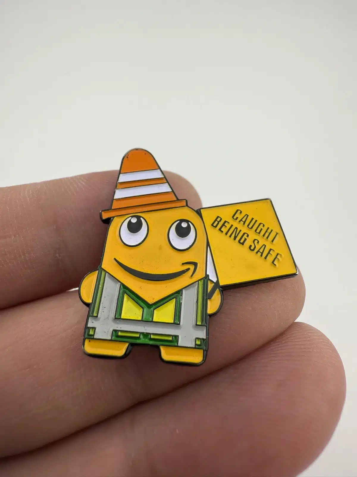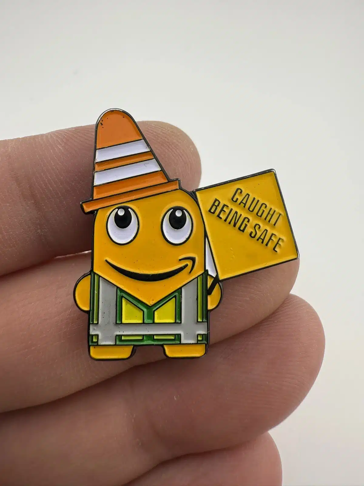 The Amazon Peccy Caught Being Safe Pin features a whimsical design of a character wearing an orange traffic cone as a hat, symbolizing safety in a playful manner.