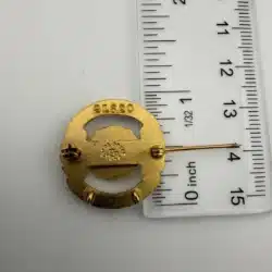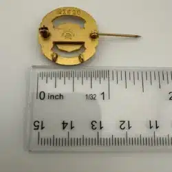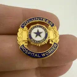 This gold tone American Legion Auxiliary Hospital Worker Volunteer pin features a blue and white enamel design that symbolizes service and dedication to veterans, showcasing the organization’s commitment to supporting those in need. The number 21820 on the rear likely is in reference to who it originally belonged to.