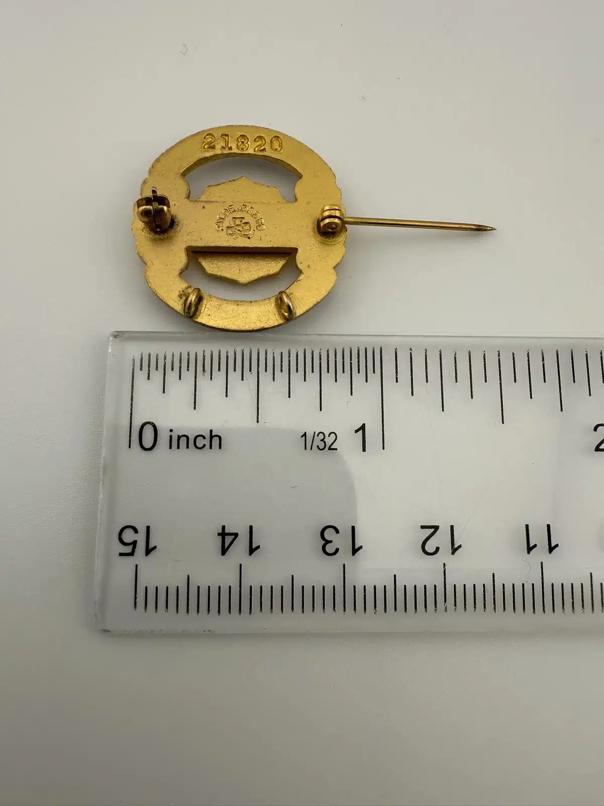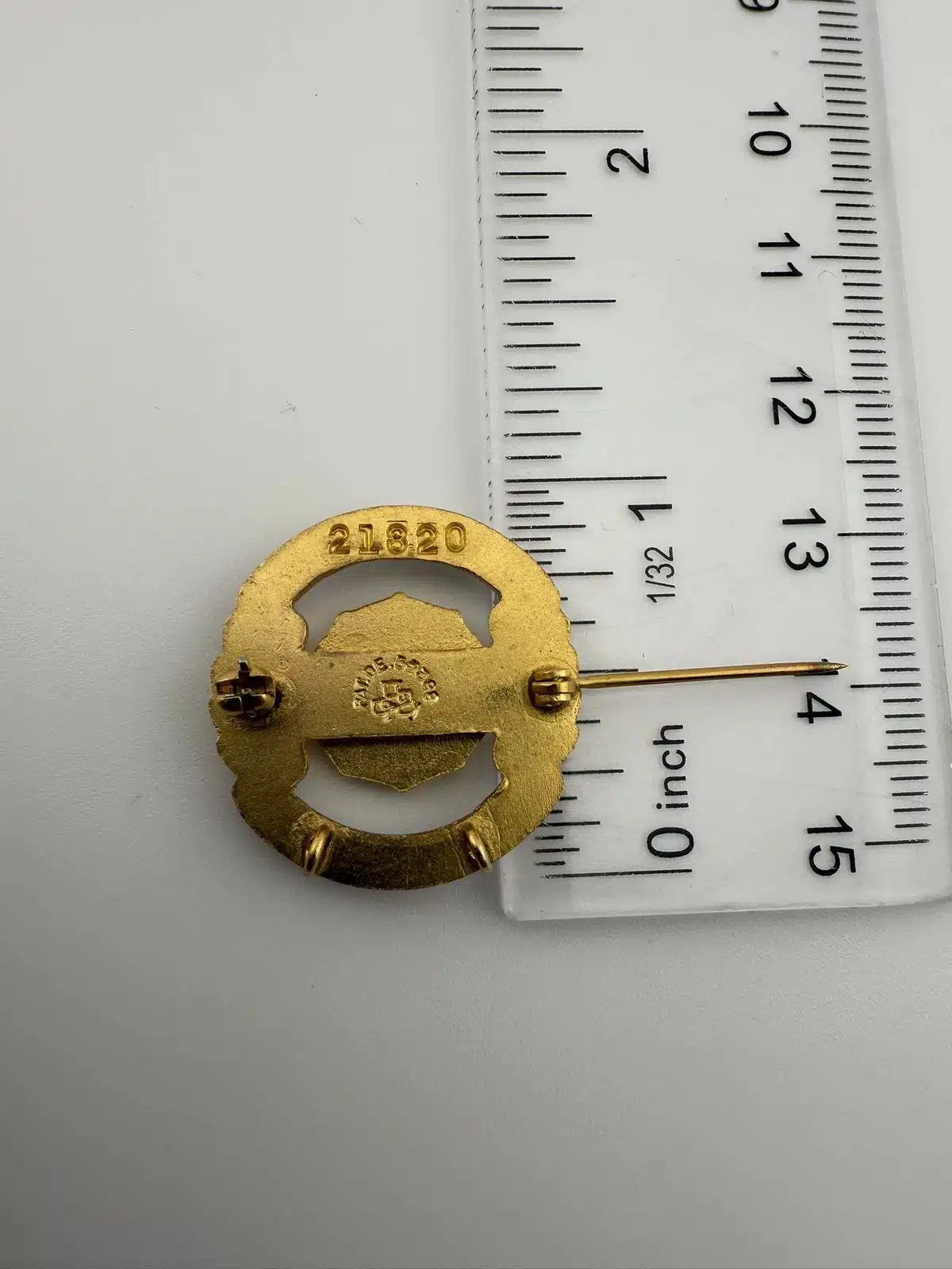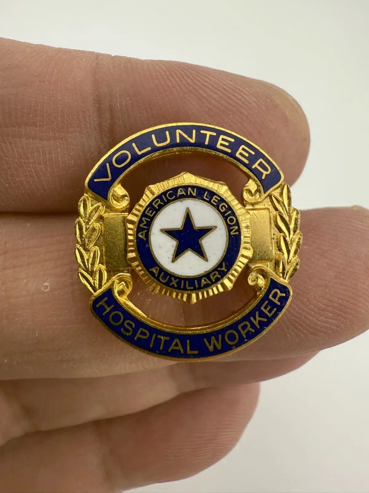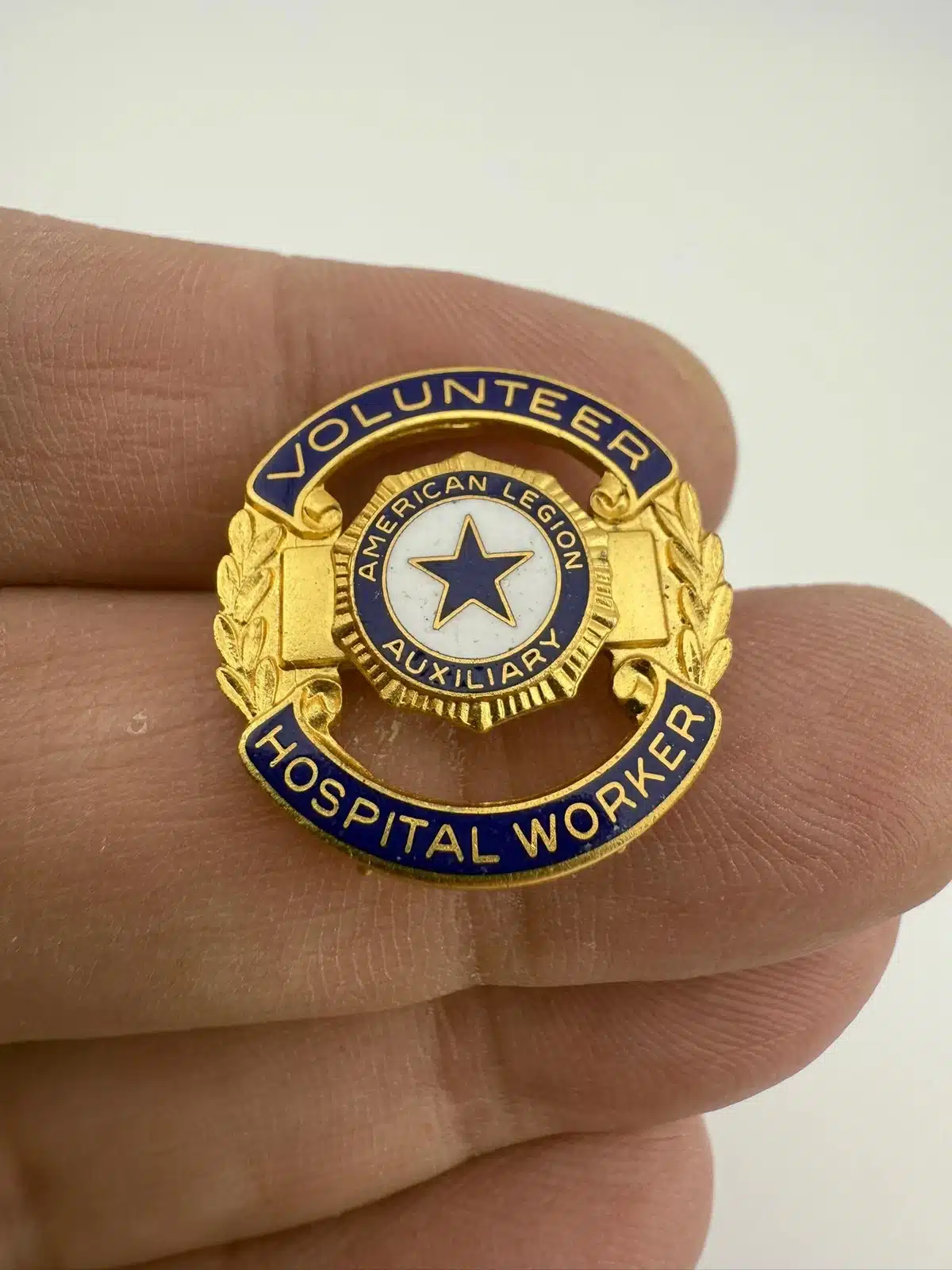 This gold tone American Legion Auxiliary Hospital Worker Volunteer pin features a blue and white enamel design that symbolizes service and dedication to veterans, showcasing the organization’s commitment to supporting those in need. The number 21820 on the rear likely is in reference to who it originally belonged to.