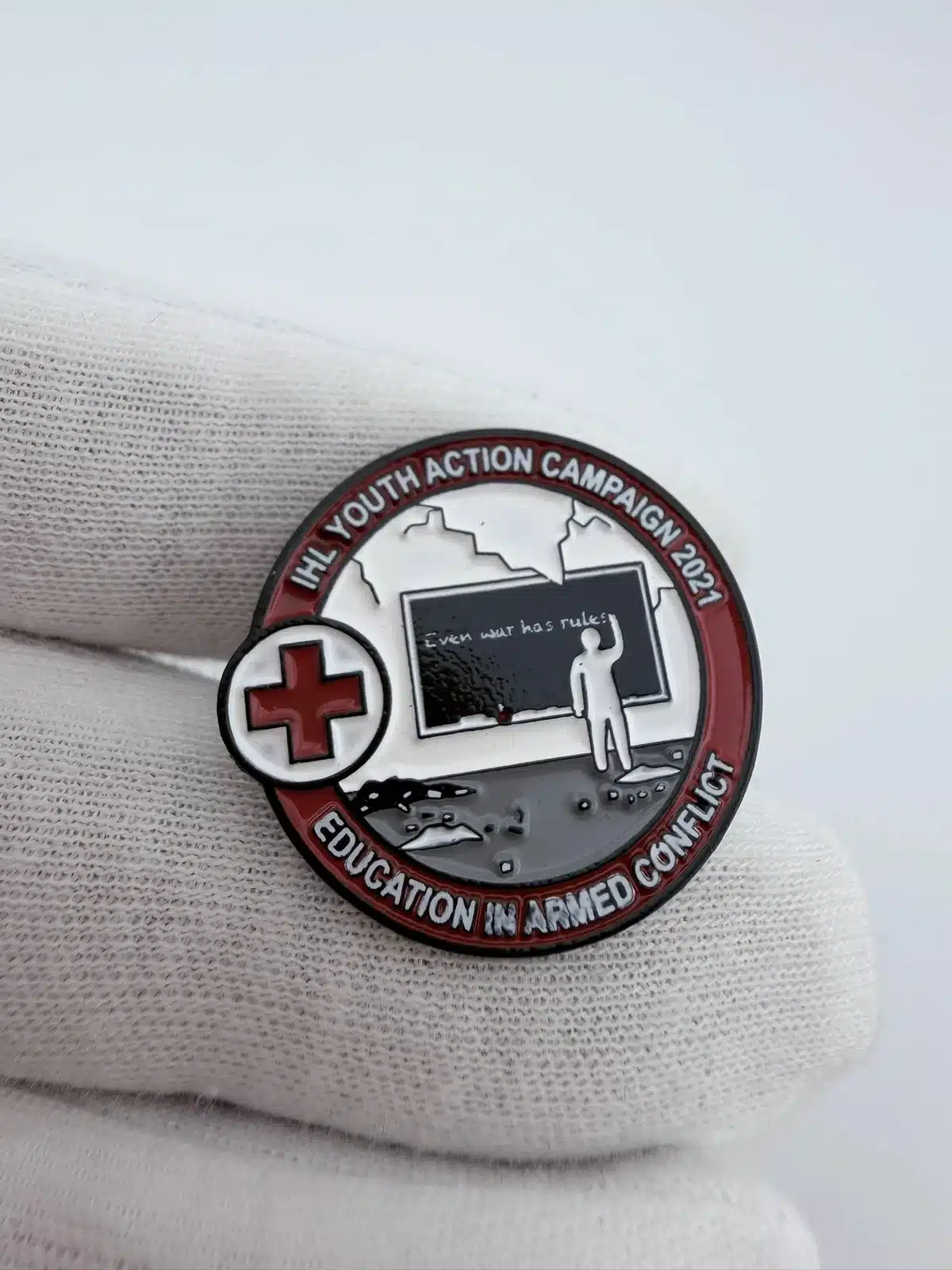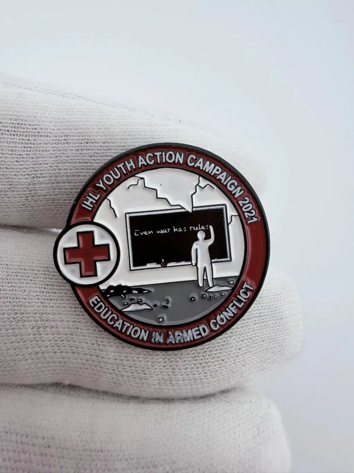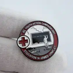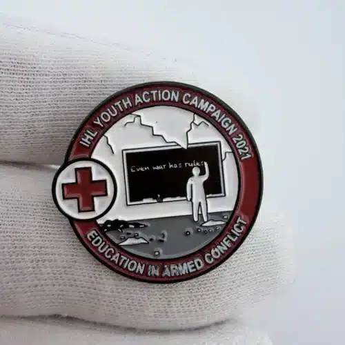 This pin features the emblem of the American Red Cross, symbolizing its commitment to humanitarian efforts in armed conflict through the International Humanitarian Law (IHL) Youth Action Campaign. The design reflects the organization’s dedication to educating youth about the principles of humanitarian law and the protection of individuals during wartime.
