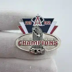 This pin celebrates the Anaheim Angels’ victory in the 2002 World Series, prominently displaying the team’s logo at the top and the championship trophy at the bottom. The silver tone finish, complemented by red, white, and blue accents, reflects the team’s colors and commemorates their historic achievement.