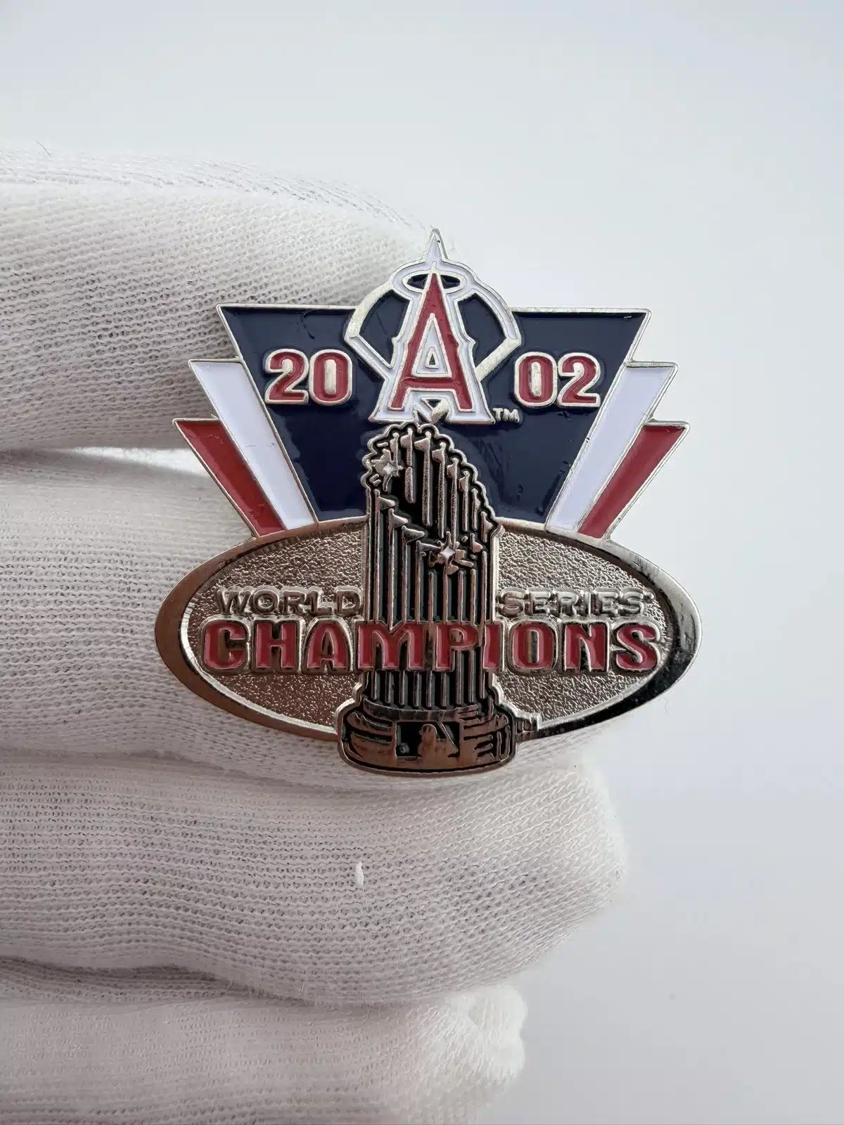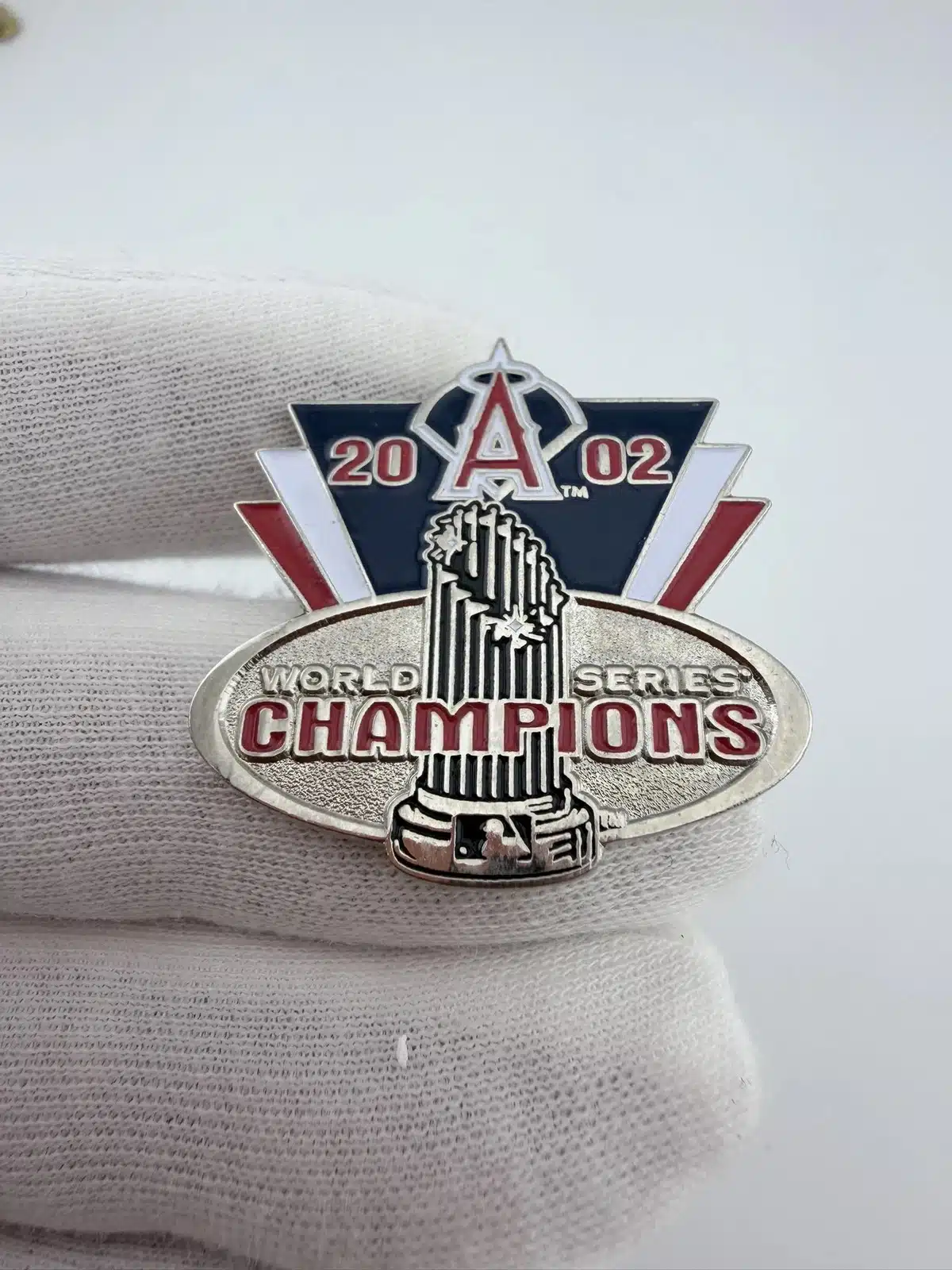 This pin celebrates the Anaheim Angels’ victory in the 2002 World Series, prominently displaying the team’s logo at the top and the championship trophy at the bottom. The silver tone finish, complemented by red, white, and blue accents, reflects the team’s colors and commemorates their historic achievement.