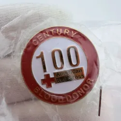 This American Red Cross pin recognizes Century Blood Donor status for giving blood 100 or more times. The pin is circular with “Century Blood Donor” around the outer edge over a red background, and at the center it features the number “100” along with the red cross symbol and “American Red Cross” text.