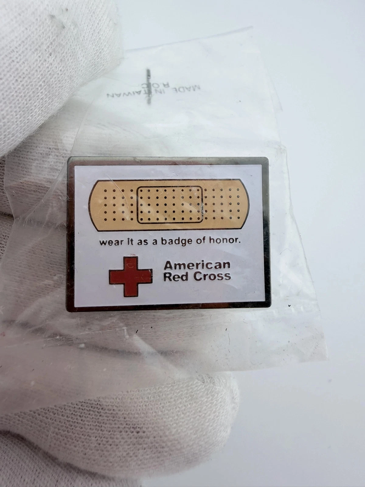 This American Red Cross pin has a white background with a bandage at the top. Beneath it is the phrase “Wear It As A Badge Of Honor,” followed by the red cross symbol and the words “American Red Cross.”