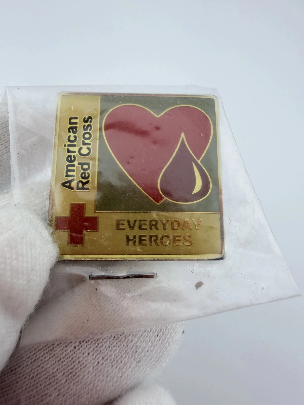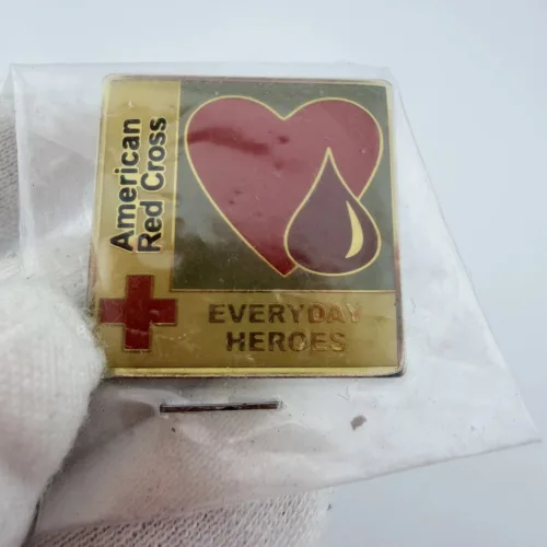 This American Red Cross pin highlights the “Everyday Heroes” theme. The square design features a red heart with a blood droplet beside it, with “American Red Cross” on the left, the red cross symbol at the lower left, and “Everyday Heroes” at the lower right.