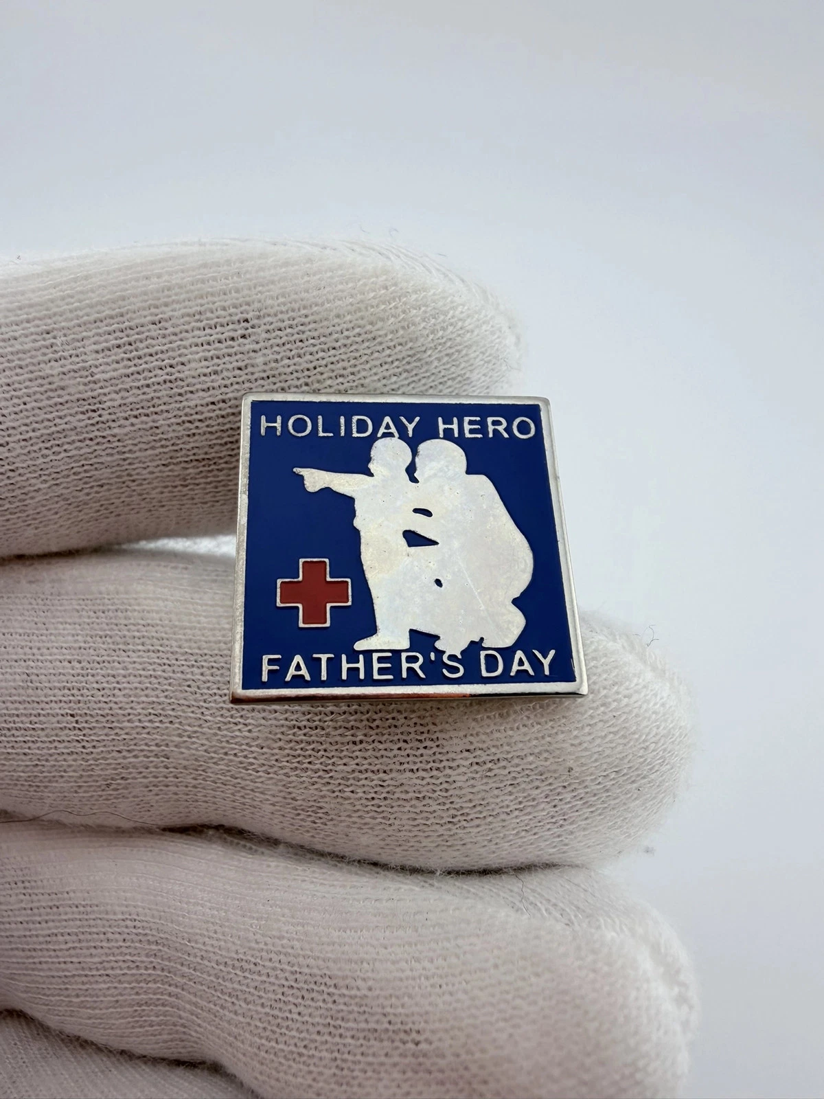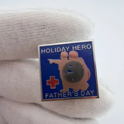 This American Red Cross Holiday Heroes pin recognizes Father’s Day. The pin features a blue background with silver tone highlights, with the red cross symbol beside the silhouette of a father and child at the center. At the top it reads “Holiday Heroes,” and at the bottom it says “Father’s Day.” These pins were given to blood donors on Father’s Day.
