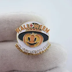 This American Red Cross Holiday Heroes pin is themed around Halloween. The pin features “Halloween” at the top in orange lettering with a red cross symbol incorporated into the “O,” and “Holiday Heroes Club” at the bottom. At the center is an orange smiling pumpkin wearing a black hat. These pins were given to blood donors on Halloween.