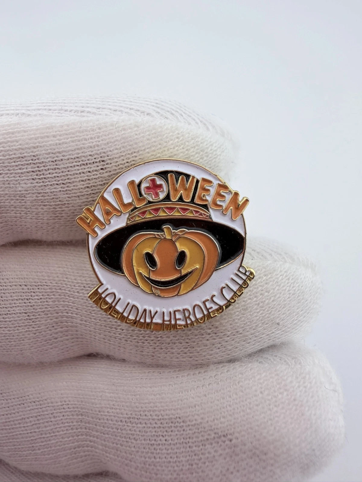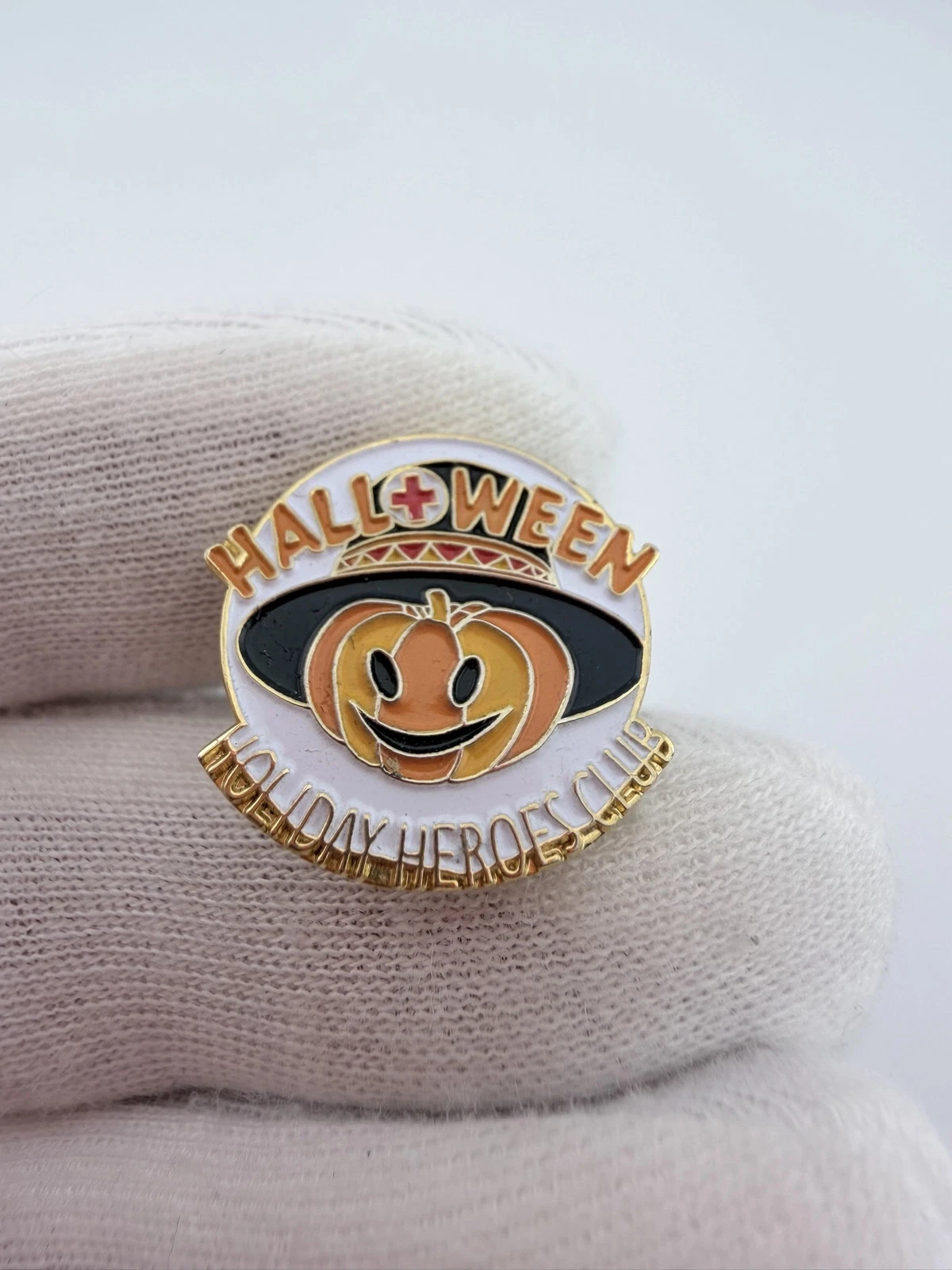 This American Red Cross Holiday Heroes pin is themed around Halloween. The pin features “Halloween” at the top in orange lettering with a red cross symbol incorporated into the “O,” and “Holiday Heroes Club” at the bottom. At the center is an orange smiling pumpkin wearing a black hat. These pins were given to blood donors on Halloween.
