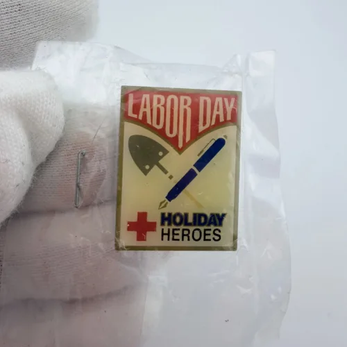 This American Red Cross Holiday Heroes pin recognizes Labor Day. The design features a writing pen crossed with a shovel at the center, with “Labor Day” at the top and the red cross symbol with the words “Holiday Heroes” at the bottom. These pins were given to blood donors on Labor Day.