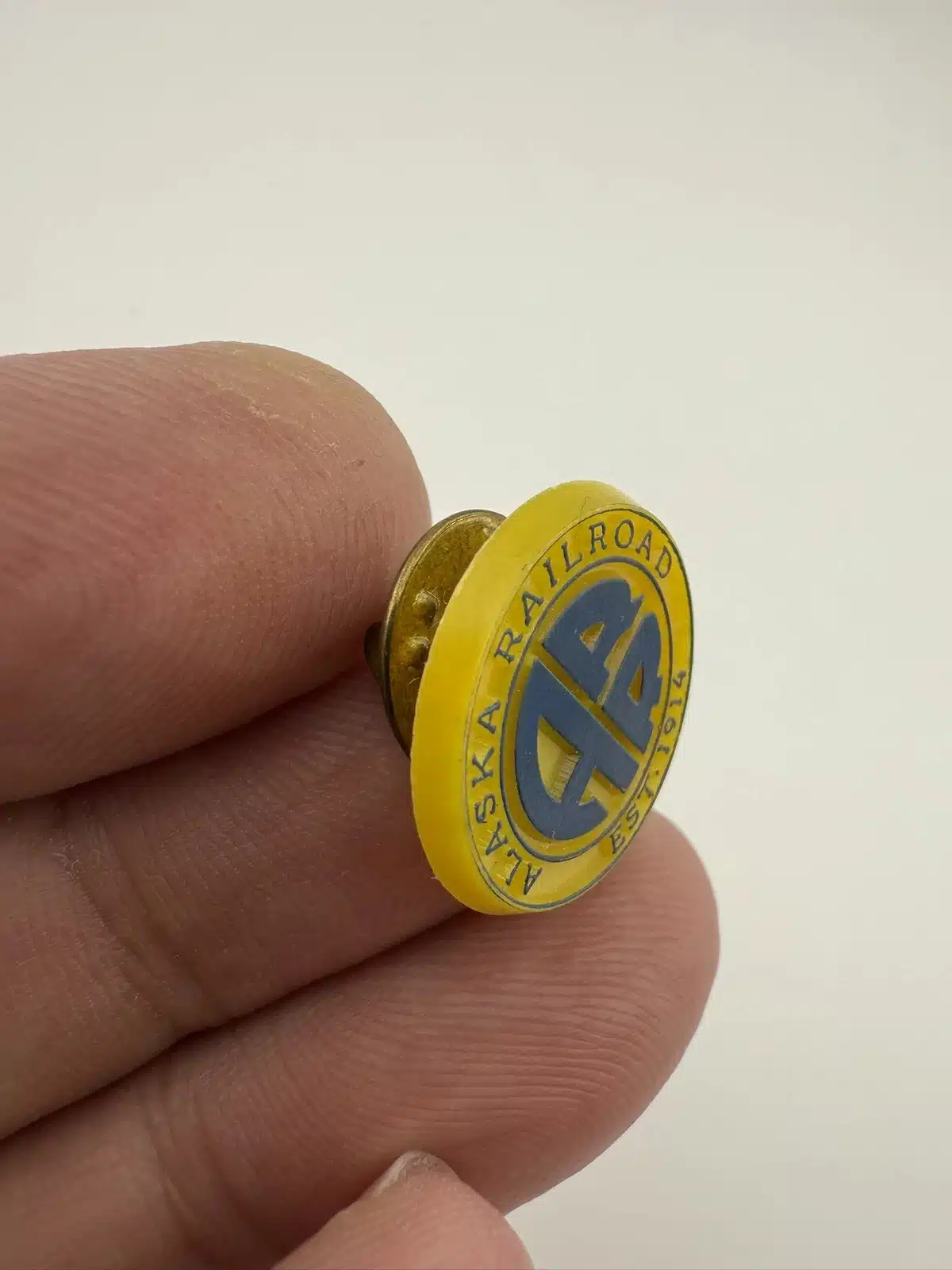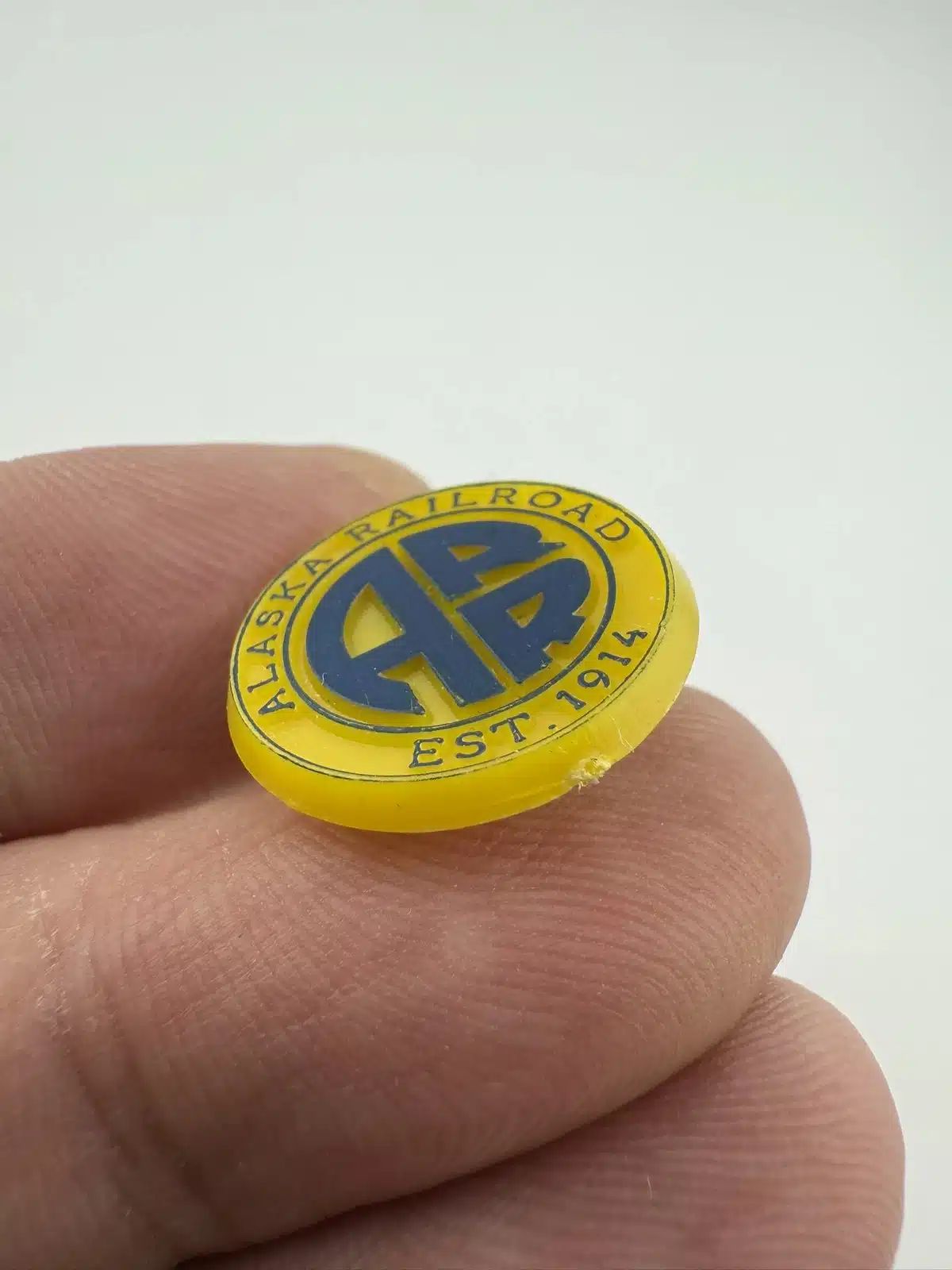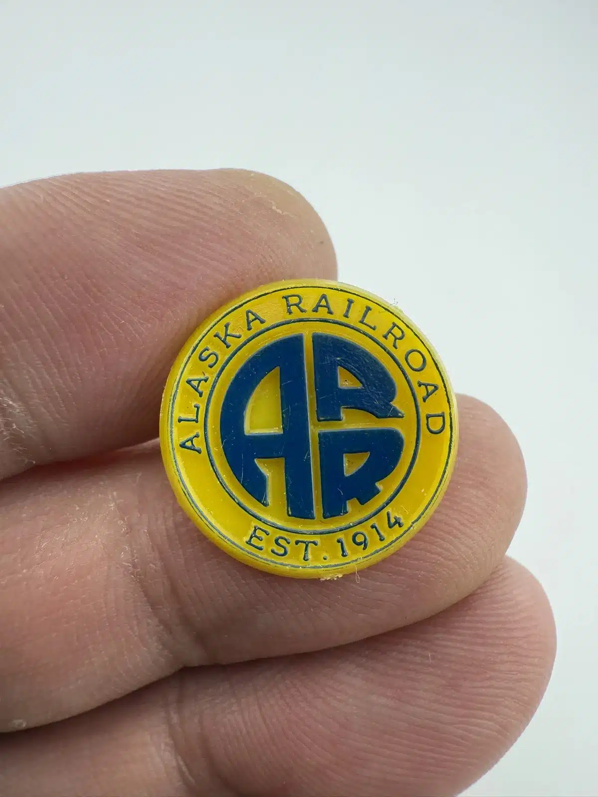 This lapel pin features the distinctive logo of the Alaska Railroad, showcasing the iconic ‘ARR’ initials in bold lettering against a yellow background. Made of plastic, this pin serves as a nostalgic reminder of the railroad’s historical significance in connecting communities across the state since 1914.