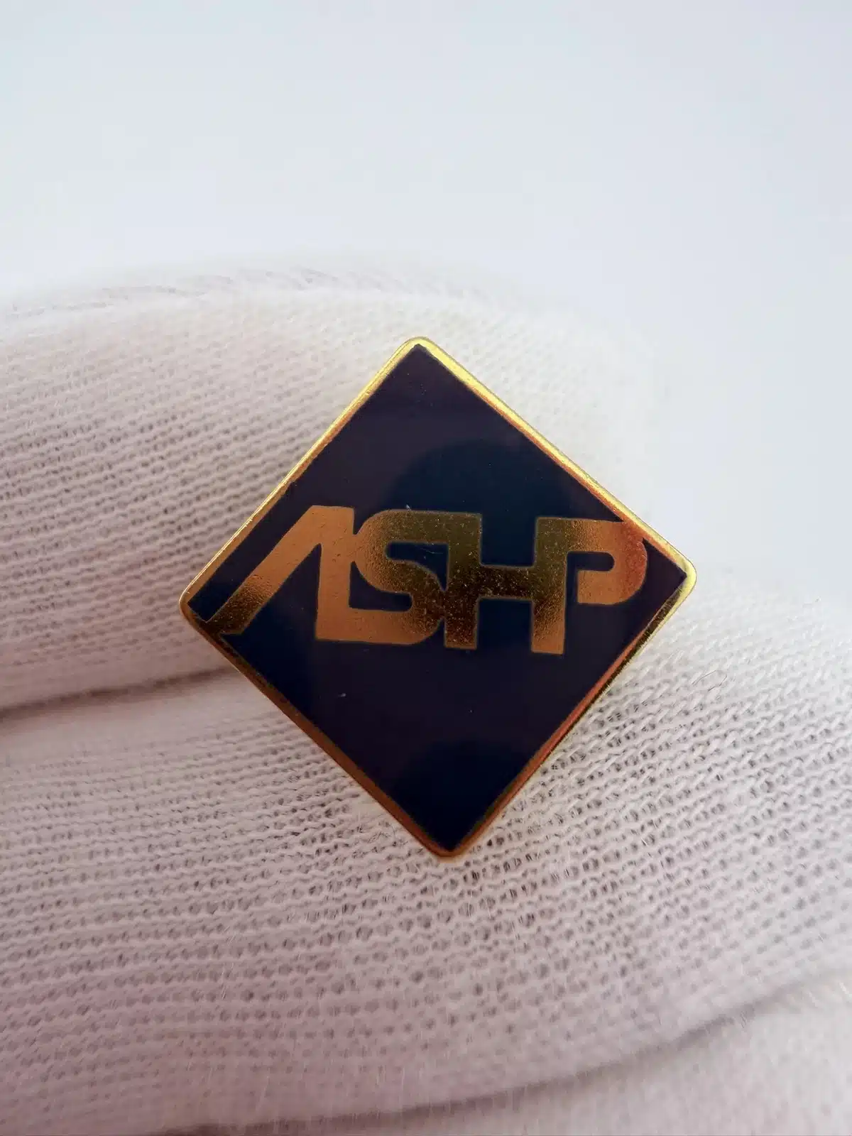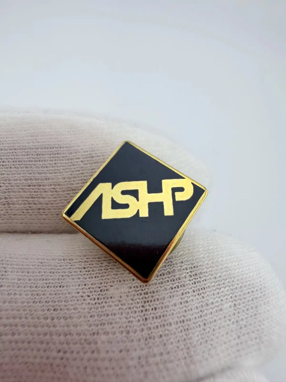 This pin features the previous logo of the American Society of Health-System Pharmacists, consisting of a bold ASHP lettering.