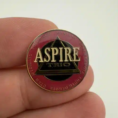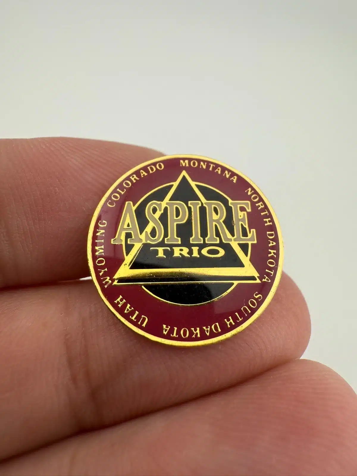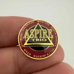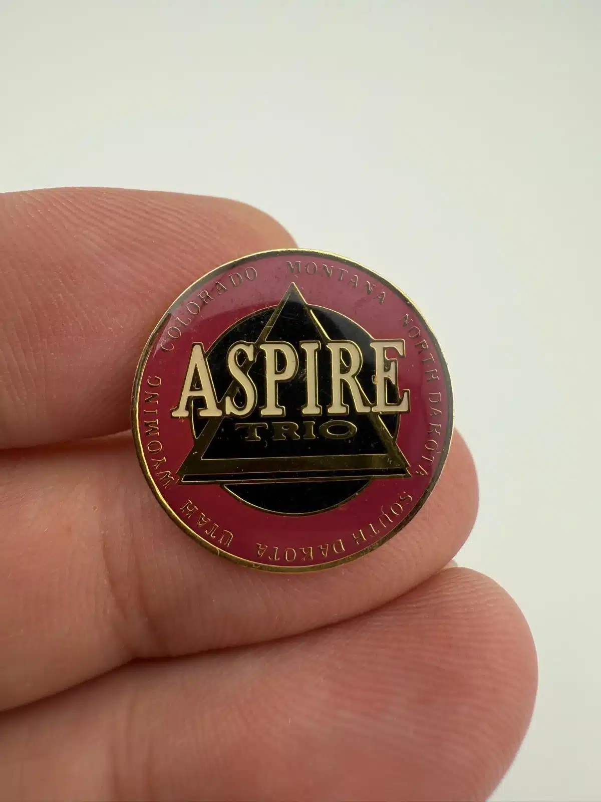 Set in a circular design, this pin features a triangle at the center with the words “Aspire Trio” written across it. Surrounding the inner portion of the pin are the names of various states including Colorado, Montana, North Dakota, South Dakota, Utah, and Wyoming.