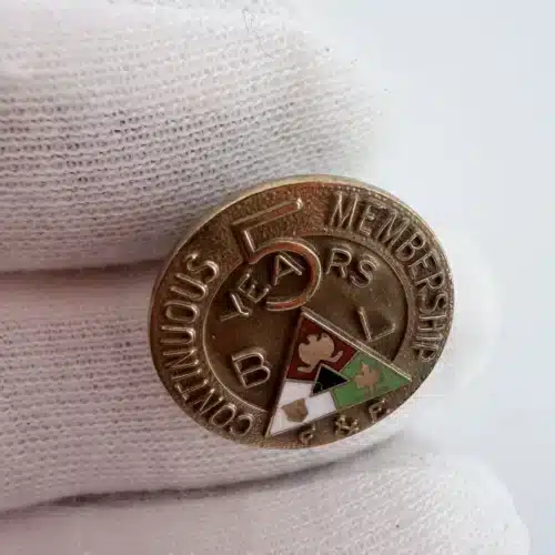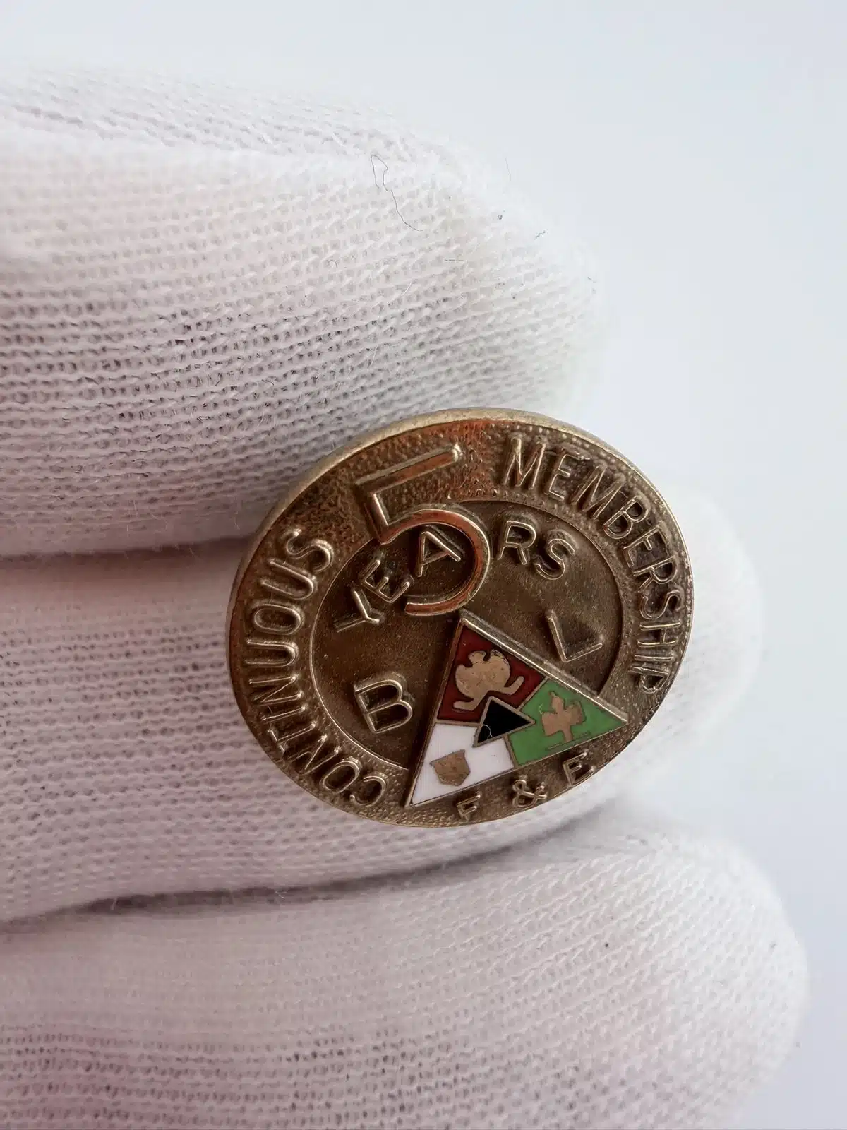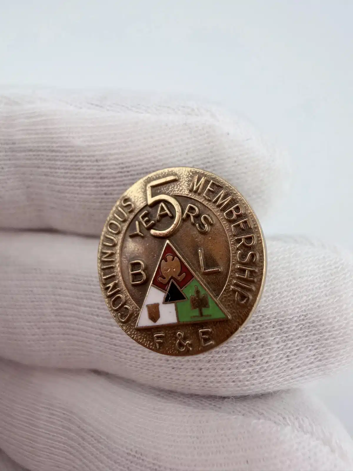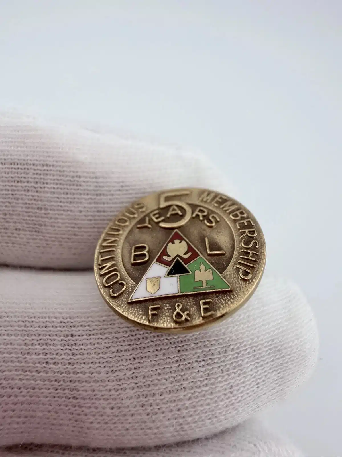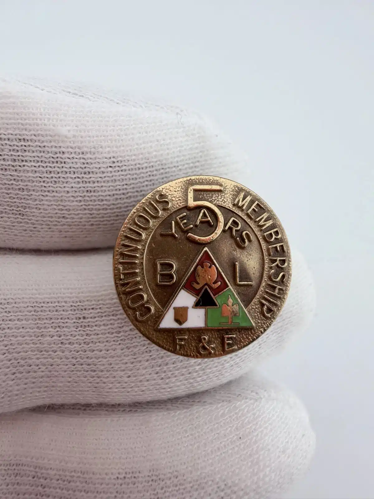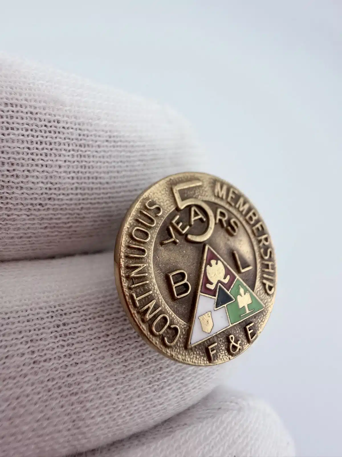 The Brotherhood of Locomotive Firemen and Enginemen was a prominent railroad labor union representing locomotive firemen and engineers, playing a significant role in labor advocacy within the railroad industry during the late 19th and 20th centuries. The 5 year member designation indicates a service milestone within the organization.