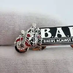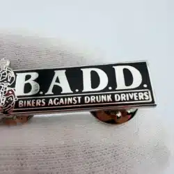This BADD pin showcases a detailed biker riding a striking red motorcycle, symbolizing the organization’s commitment to combating drunk driving. The design emphasizes the motorcycle culture while promoting a serious message about safety and responsibility on the roads.