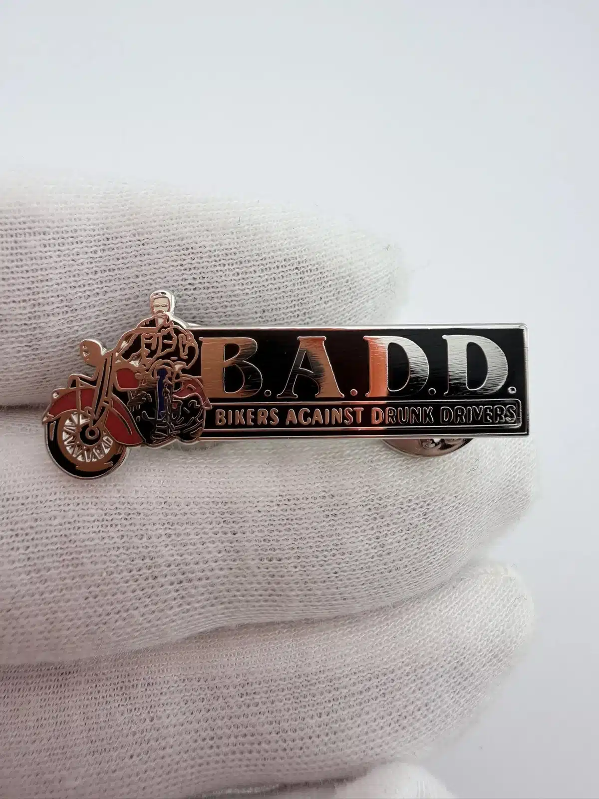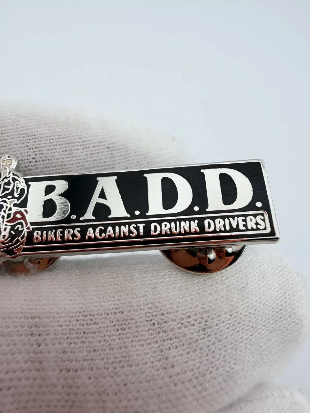 This BADD pin showcases a detailed biker riding a striking red motorcycle, symbolizing the organization’s commitment to combating drunk driving. The design emphasizes the motorcycle culture while promoting a serious message about safety and responsibility on the roads.