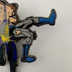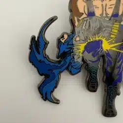 This enamel pin features a striking depiction of Bane breaking Batman’s back, capturing a pivotal moment from the iconic “Knightfall” storyline in the DC Comics universe. The vibrant colors and detailed design highlight the intense action and drama that defined this significant chapter in Batman’s history. This is a pre-owned fan created pin by JMOPins of San Francisco, California.