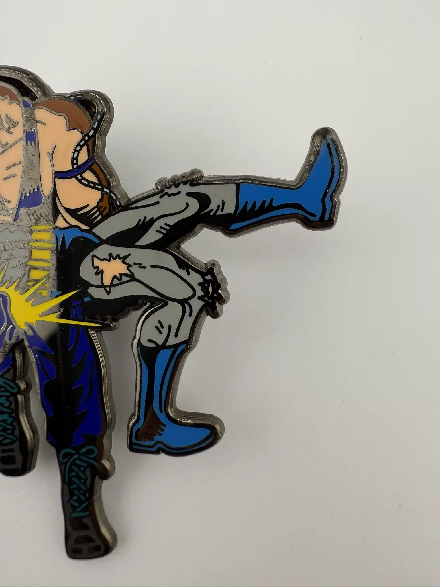 This enamel pin features a striking depiction of Bane breaking Batman’s back, capturing a pivotal moment from the iconic “Knightfall” storyline in the DC Comics universe. The vibrant colors and detailed design highlight the intense action and drama that defined this significant chapter in Batman’s history. This is a pre-owned fan created pin by JMOPins of San Francisco, California.