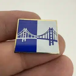 Unknown bridge pin with a flipped color scheme from one side to the next. Possibly the Golden Gate Bridge in California?