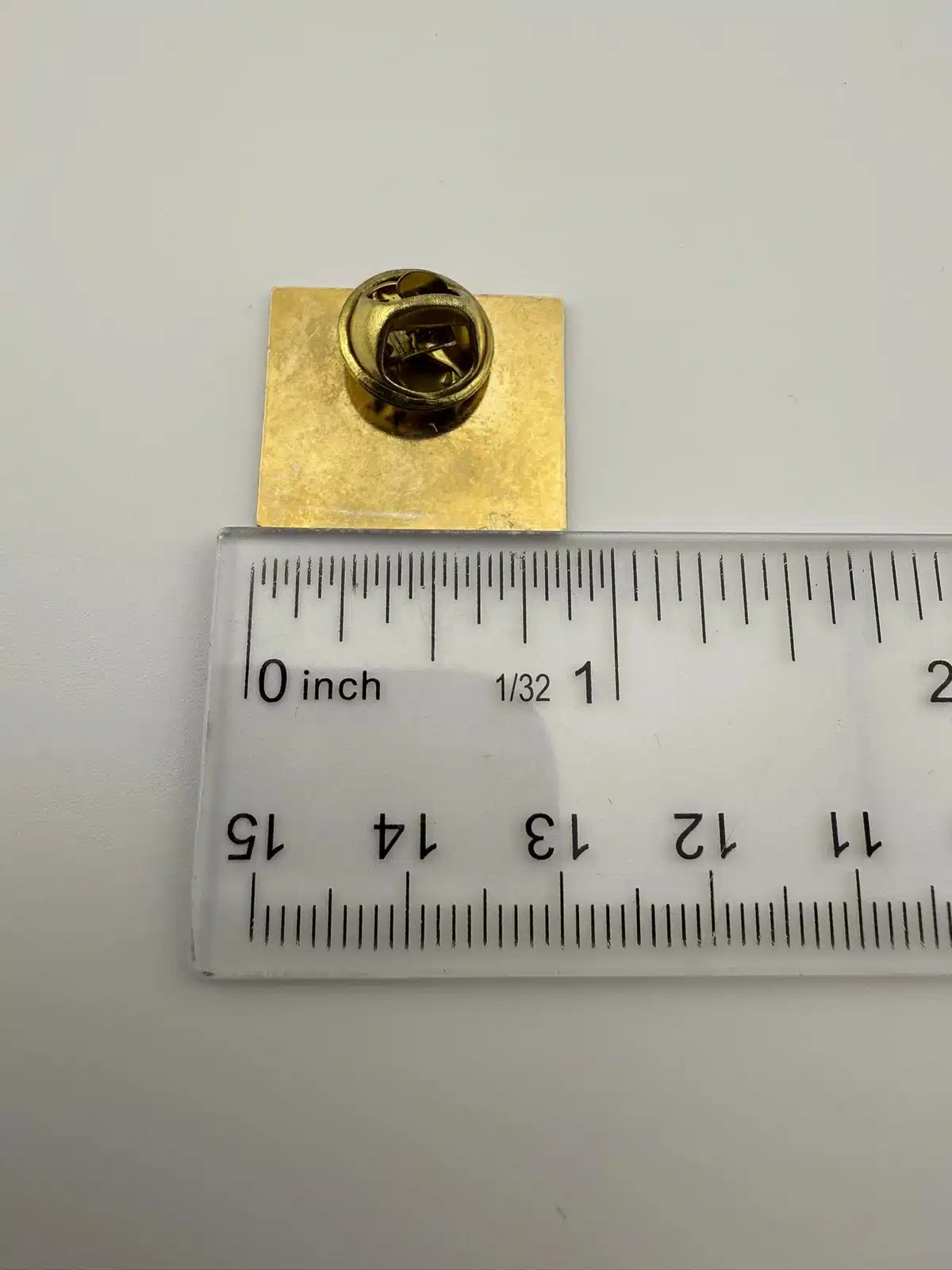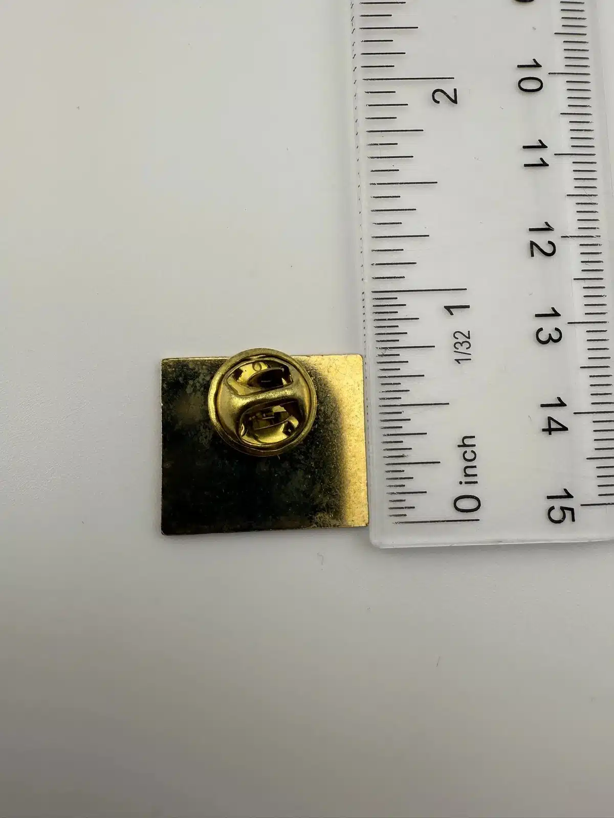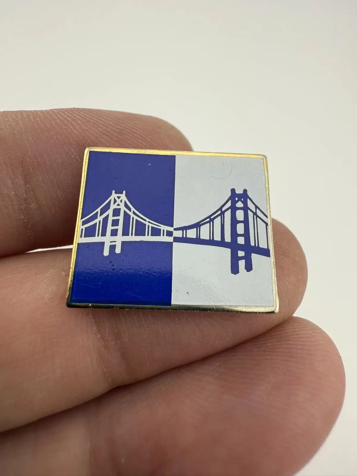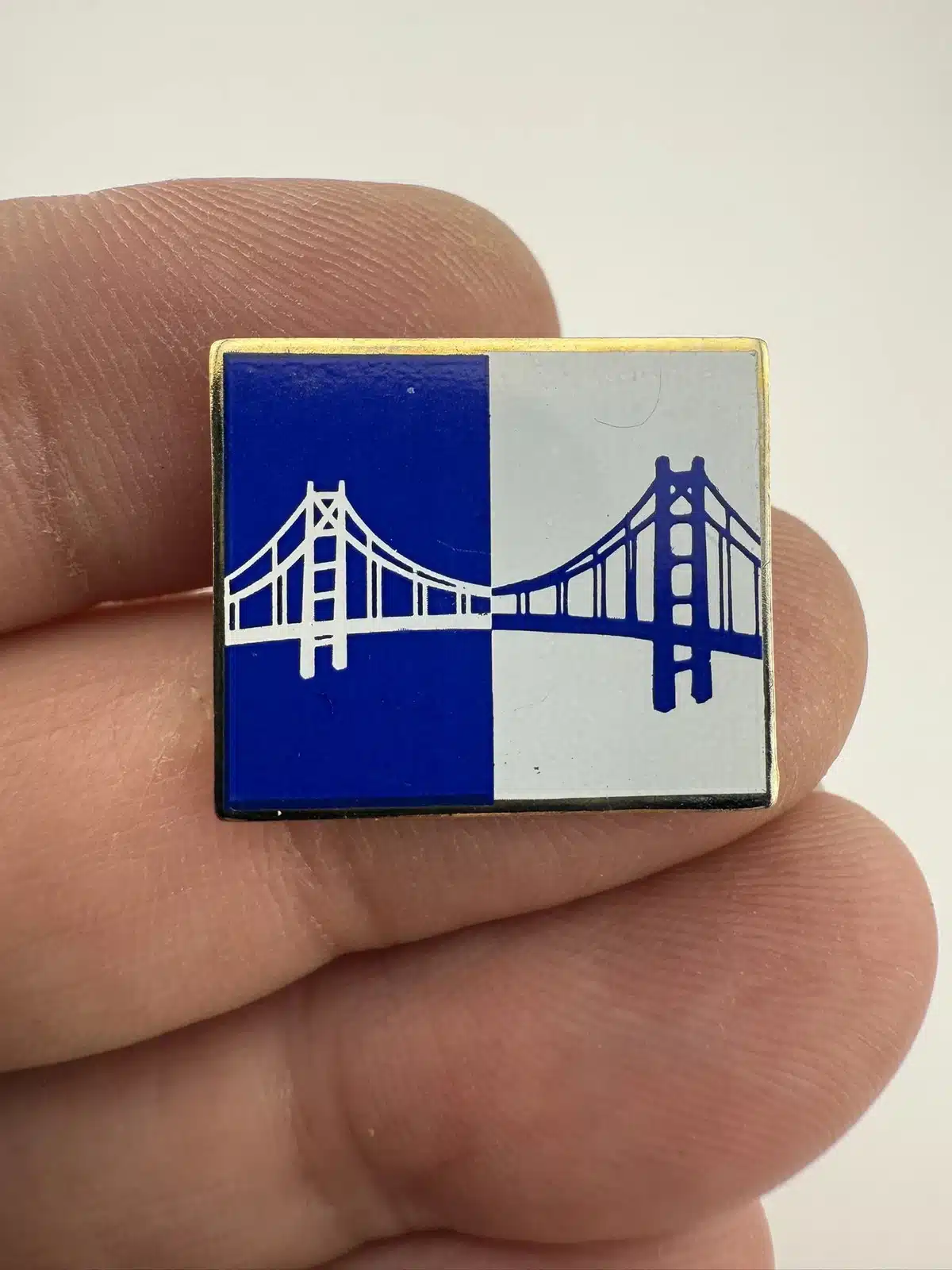 Unknown bridge pin with a flipped color scheme from one side to the next. Possibly the Golden Gate Bridge in California?