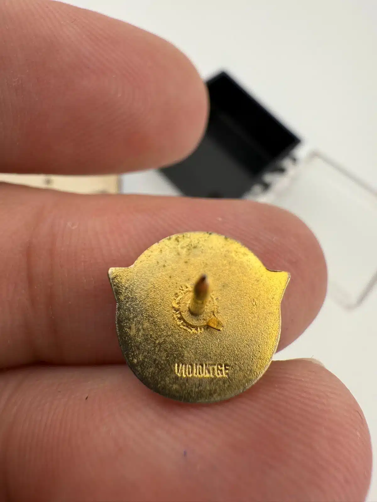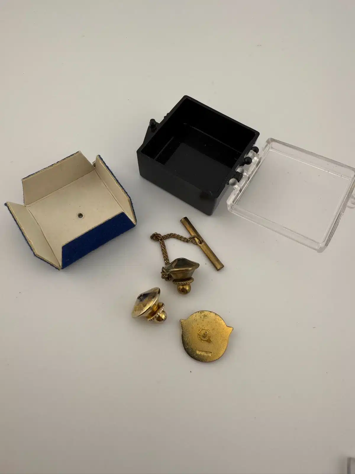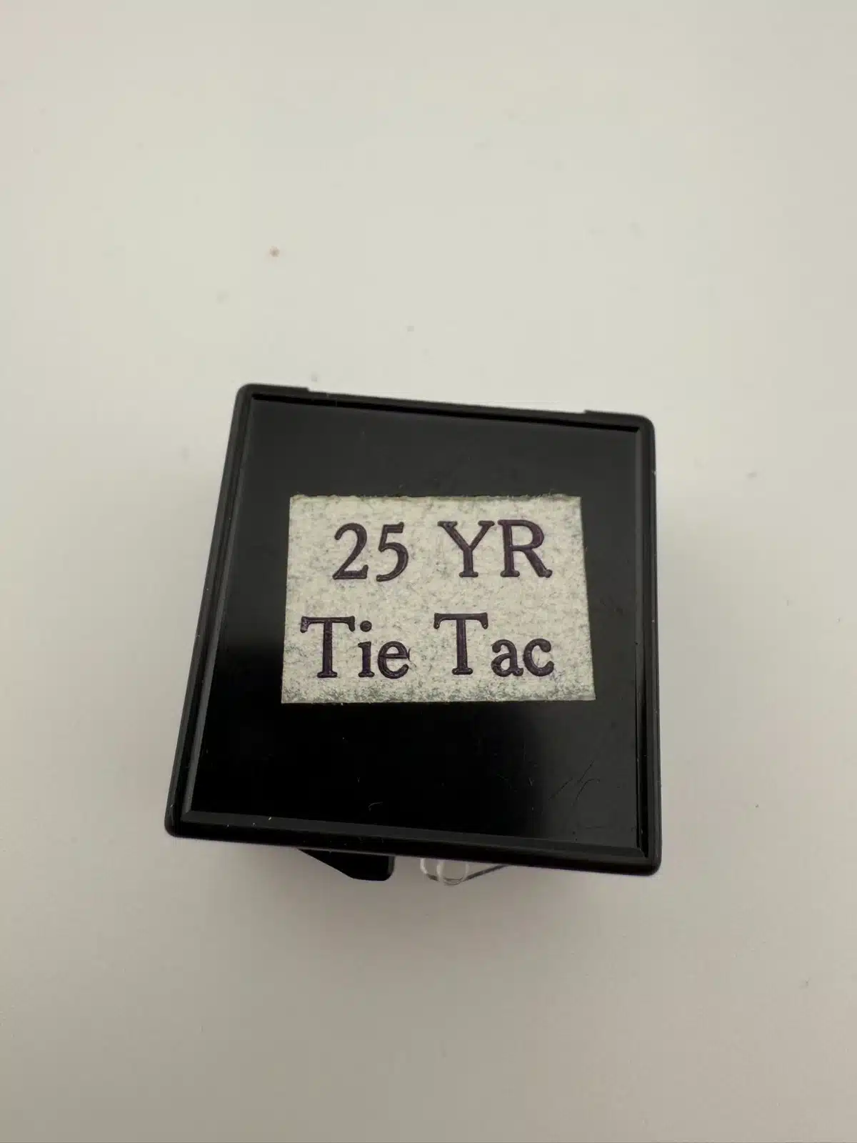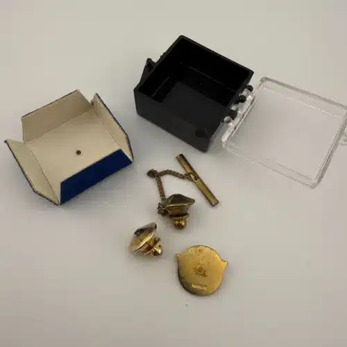 Used with minor marks and some light corrosion on back of pin. Comes with box and tie tack clasp as well as tie tack clasp on chain with bar. Please see all photos for exact condition of item and size.