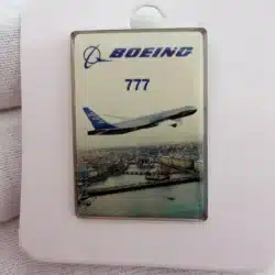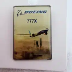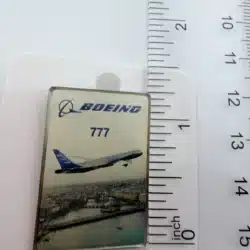 The Boeing 777 lapel pin showcases the iconic Boeing logo above a detailed depiction of a 777 jet soaring over a city and waterway, capturing the essence of modern aviation. The 777X pin features the Boeing logo as well, with a striking image of a 777X jet emerging from a fog-covered city skyline, symbolizing the next generation of commercial aircraft.