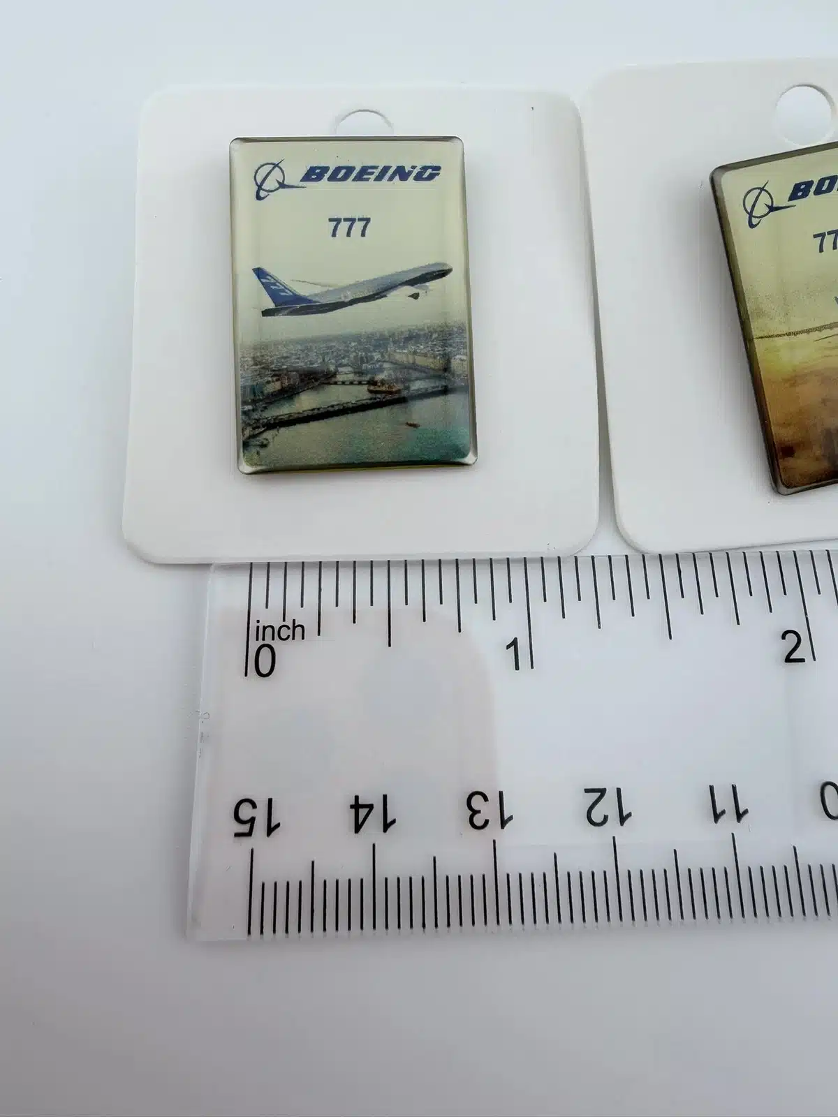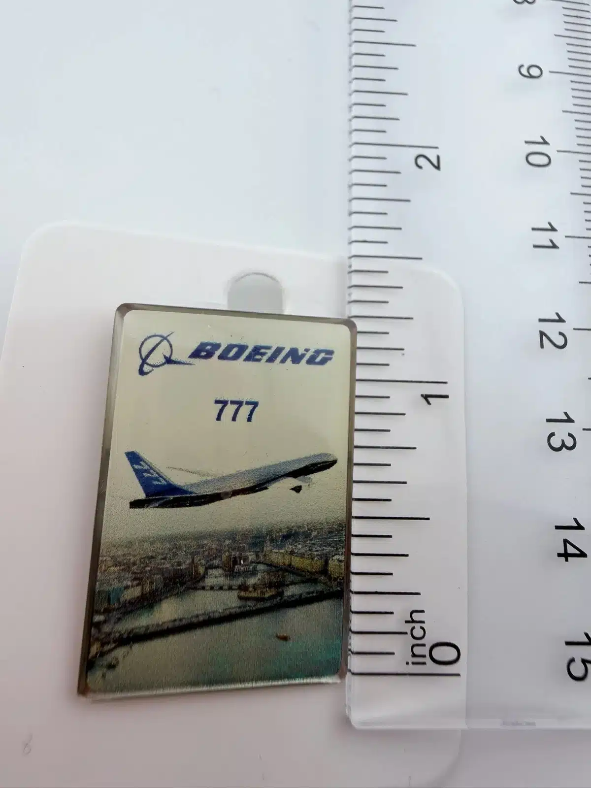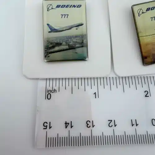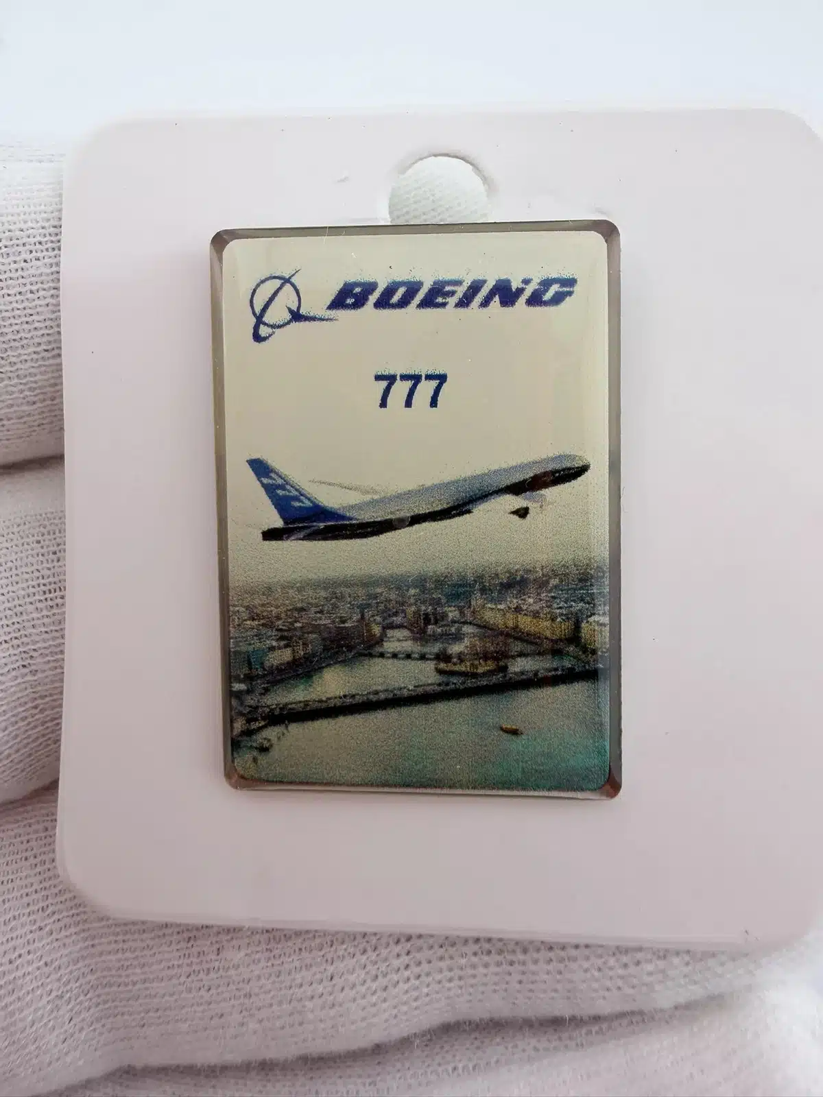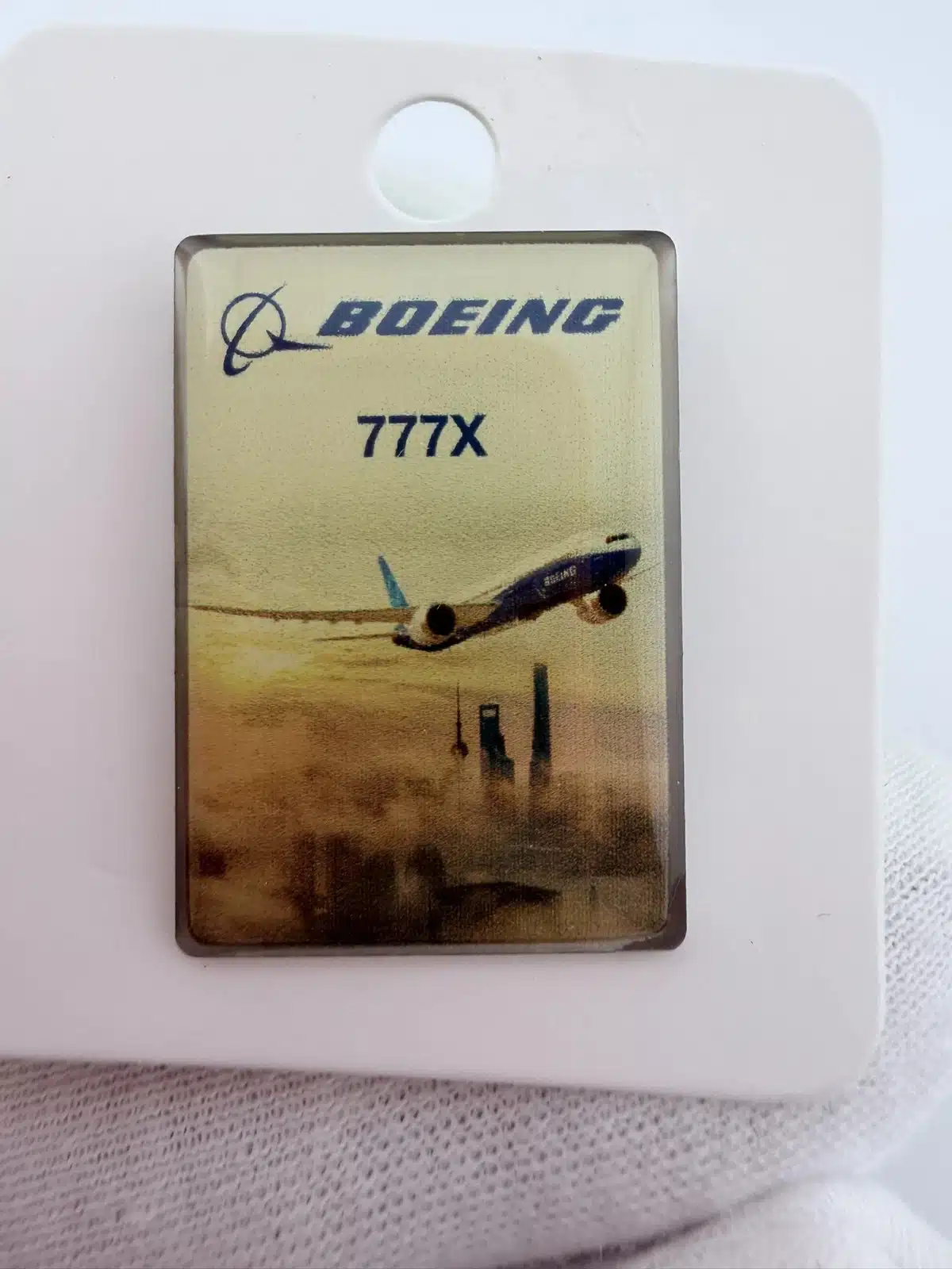 The Boeing 777 lapel pin showcases the iconic Boeing logo above a detailed depiction of a 777 jet soaring over a city and waterway, capturing the essence of modern aviation. The 777X pin features the Boeing logo as well, with a striking image of a 777X jet emerging from a fog-covered city skyline, symbolizing the next generation of commercial aircraft.