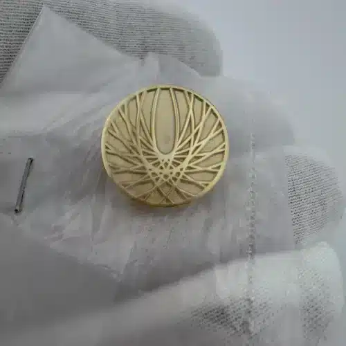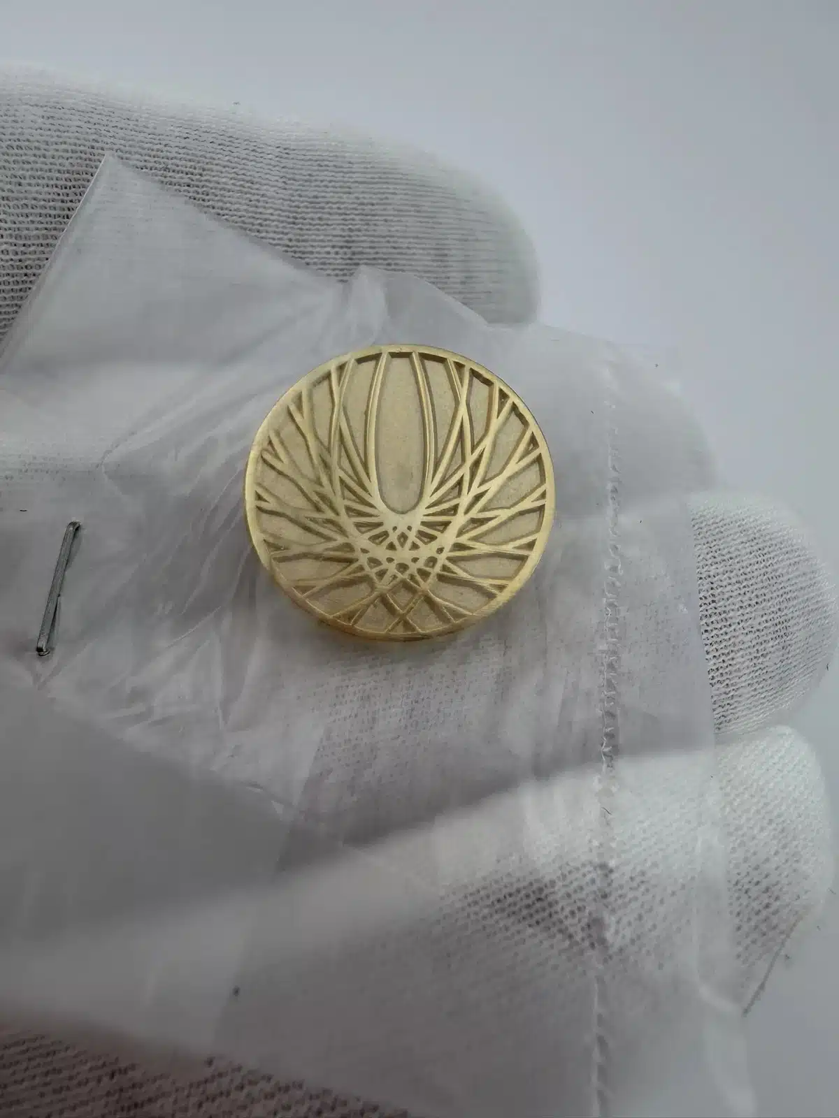 This gold tone pin features a design inspired by the forward fuselage of Boeing aircraft, showcasing intricate spirograph patterns that evoke a sense of engineering precision and innovation. The pin reflects Boeing’s legacy in aerospace technology, symbolizing the company’s contributions to aviation design and manufacturing.