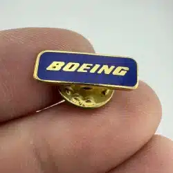 This Boeing logo pin features a striking blue enamel background accented by gold tone highlights, showcasing the iconic aircraft manufacturer’s branding.