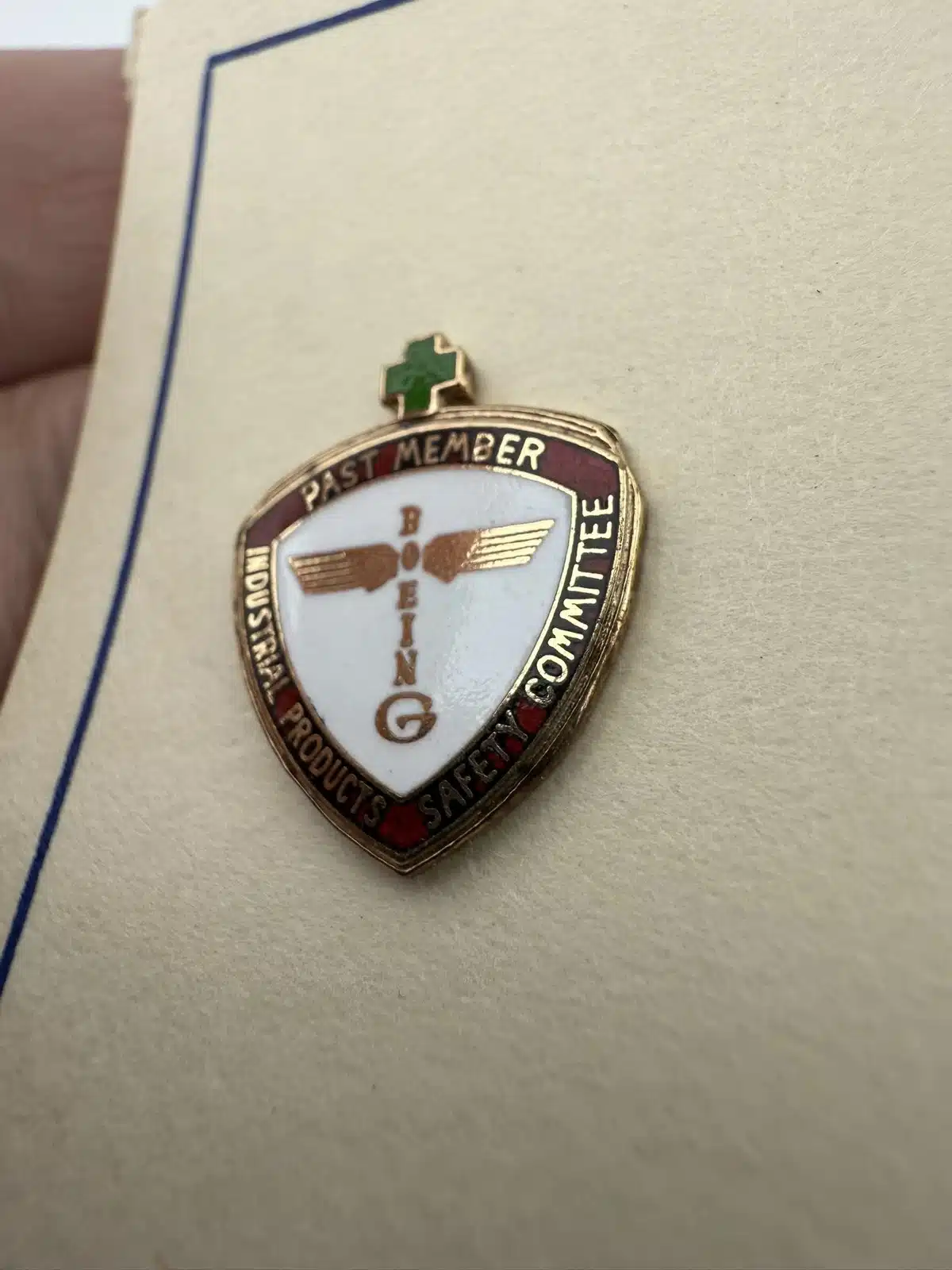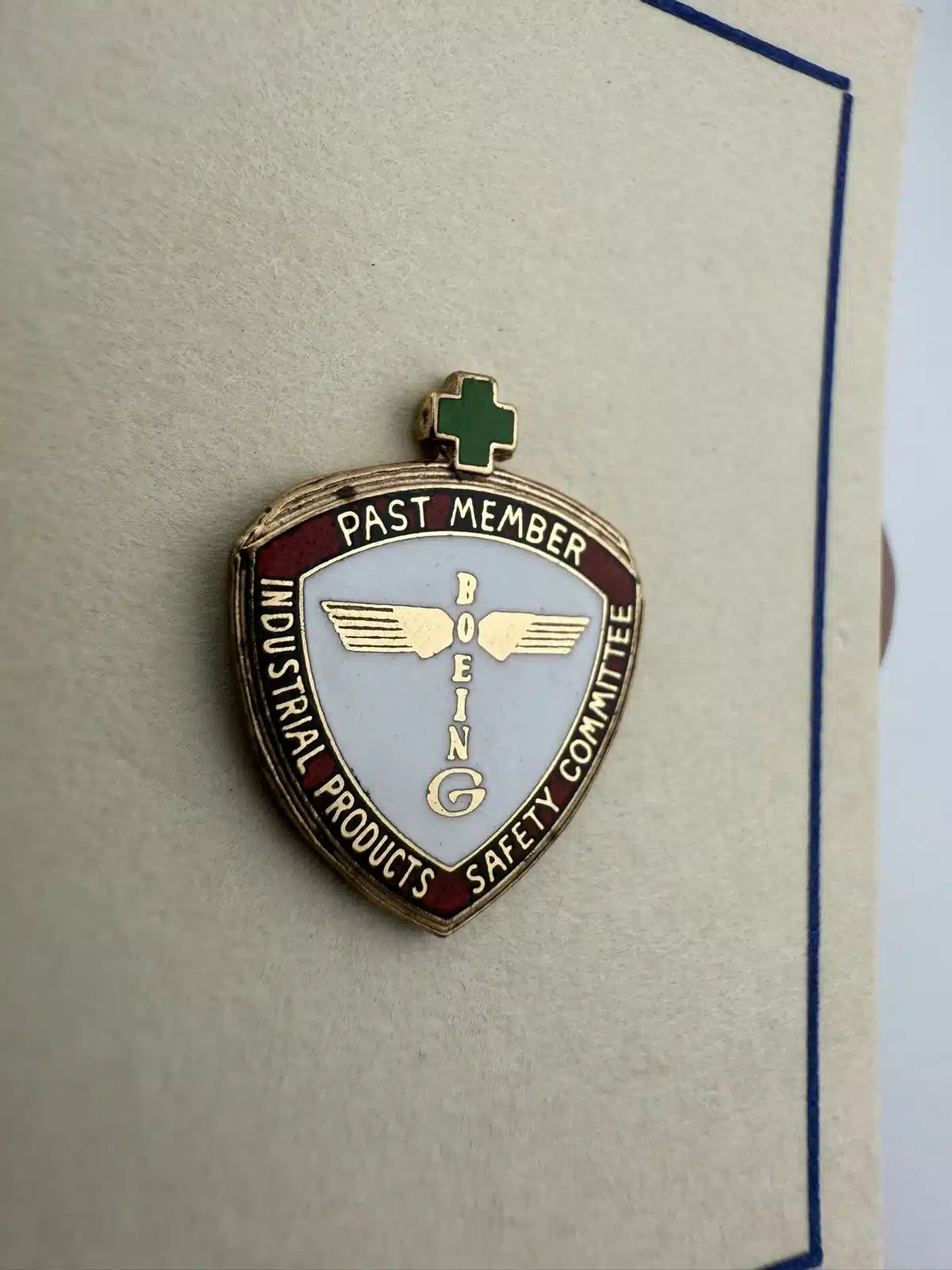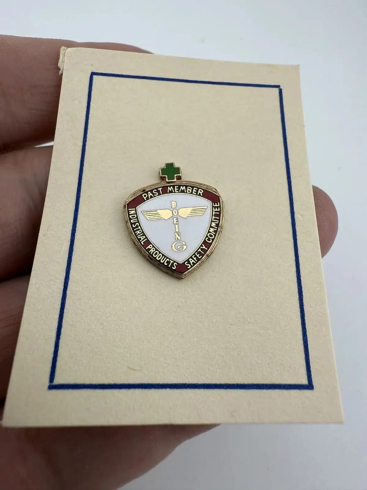 This extremely rare pin features the older totem pole style Boeing logo prominently in the center, a small green cross at top, and is for a past member of the Industrial Products Safety Committee. Its design reflects the company’s commitment to safety and innovation in aerospace engineering. Most likely still on the original paper backing it came on. I was only able to find one of these that has sold in the past 15 years.
