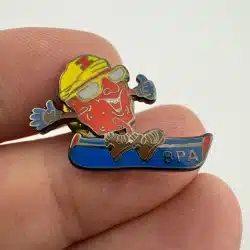 This pin features a red raisin character riding a snowboard, wearing a yellow cap with the letter I on the front and giving a thumbs up. The snowboard displays the letters BPA, with the overall design presented in a playful, cartoon-style layout.