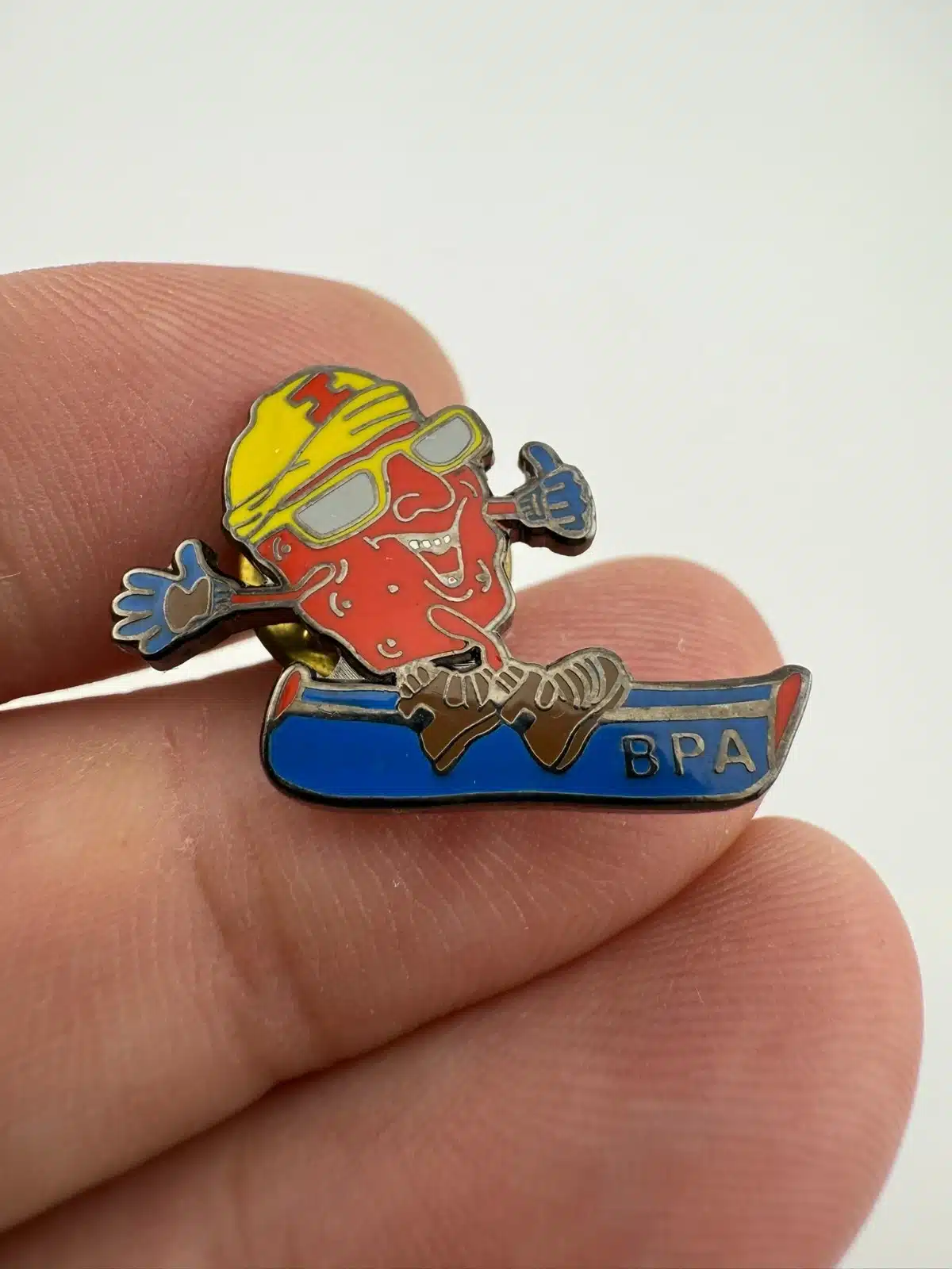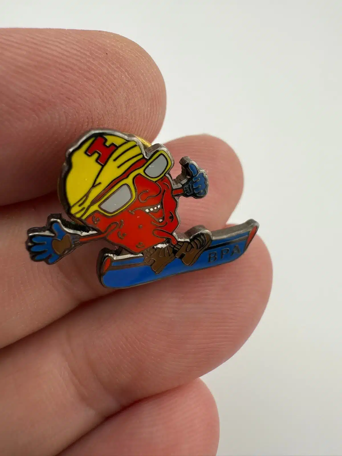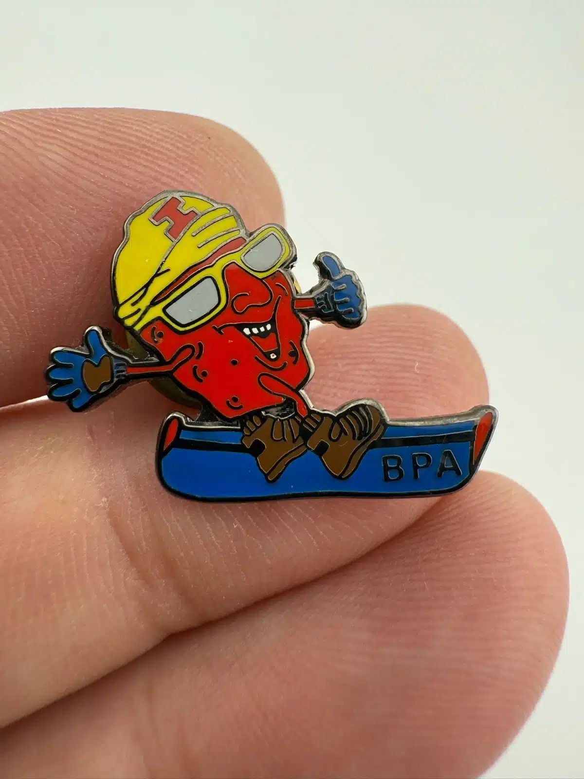 This pin features a red raisin character riding a snowboard, wearing a yellow cap with the letter I on the front and giving a thumbs up. The snowboard displays the letters BPA, with the overall design presented in a playful, cartoon-style layout.