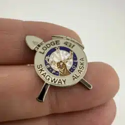 This pin features the emblem of the Benevolent and Protective Order of Elks (BPOE) Lodge 431, representing the Skagway, Alaska chapter, adorned with a pick and shovel mining motif.