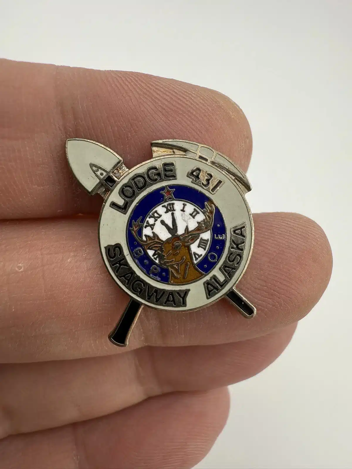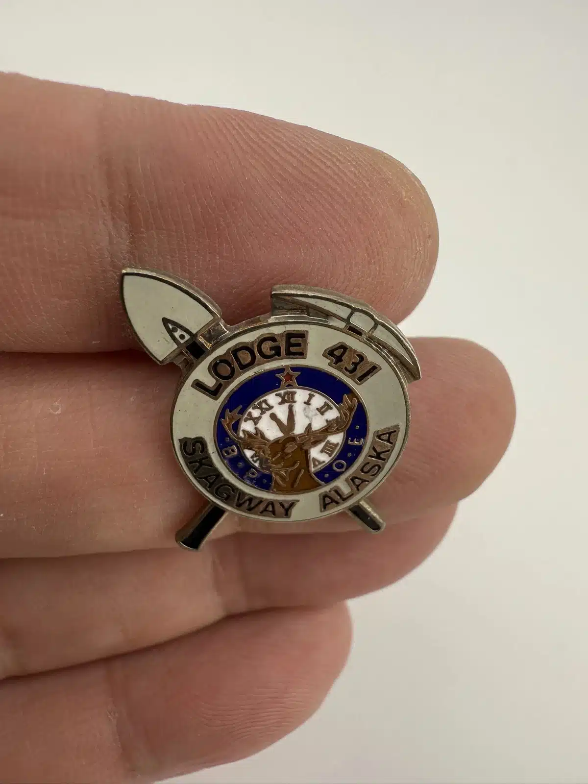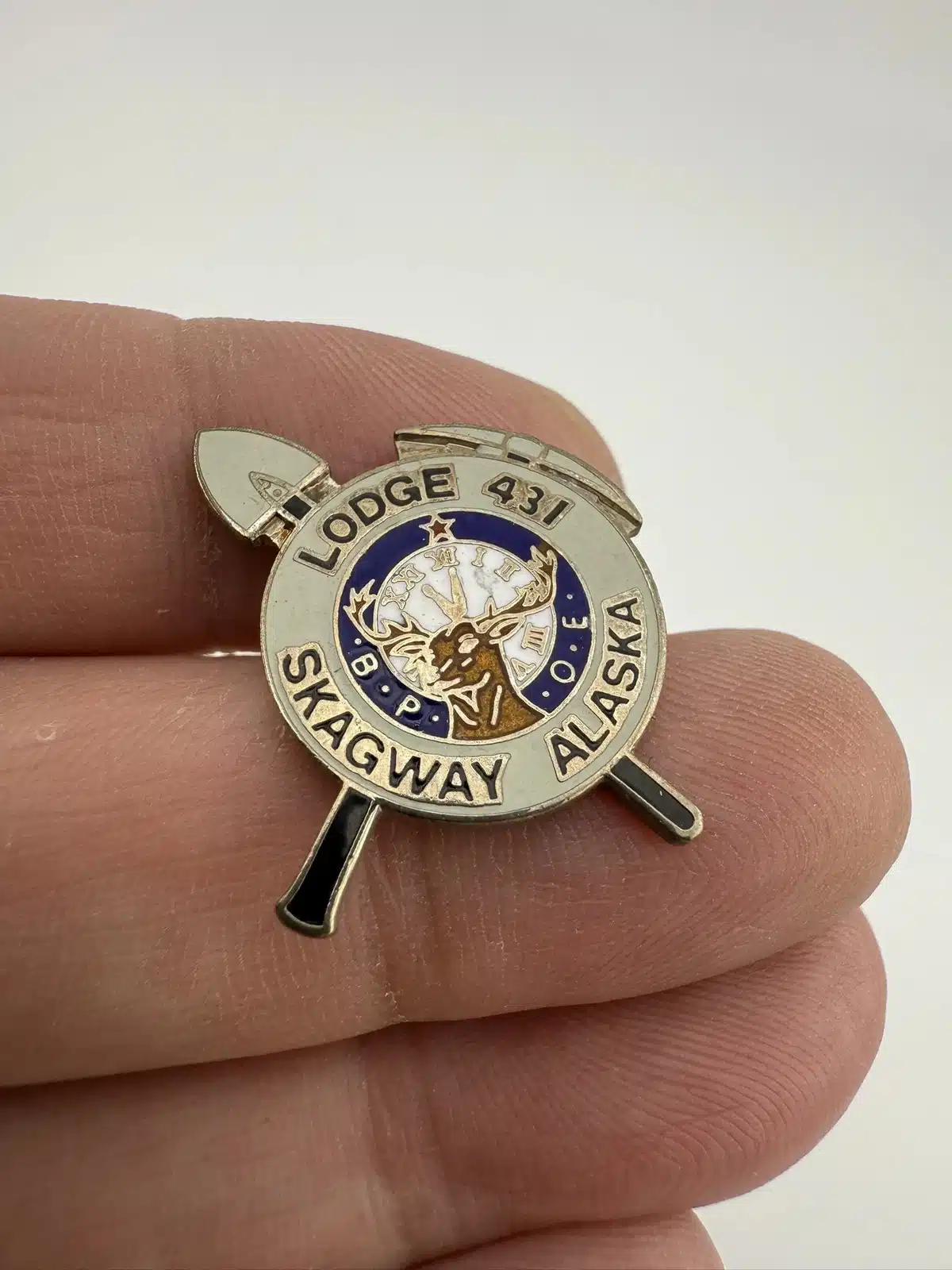 This pin features the emblem of the Benevolent and Protective Order of Elks (BPOE) Lodge 431, representing the Skagway, Alaska chapter, adorned with a pick and shovel mining motif.