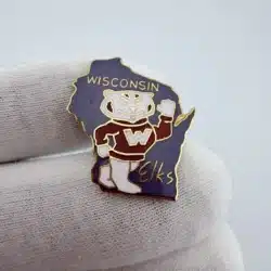 This pin features the outline of Wisconsin in purple, prominently displaying Bucky Badger, the University of Wisconsin-Madison’s mascot, waving cheerfully near the bottom of the state. The design incorporates the word “Elks,” referencing the Elks Lodge fraternal organization.