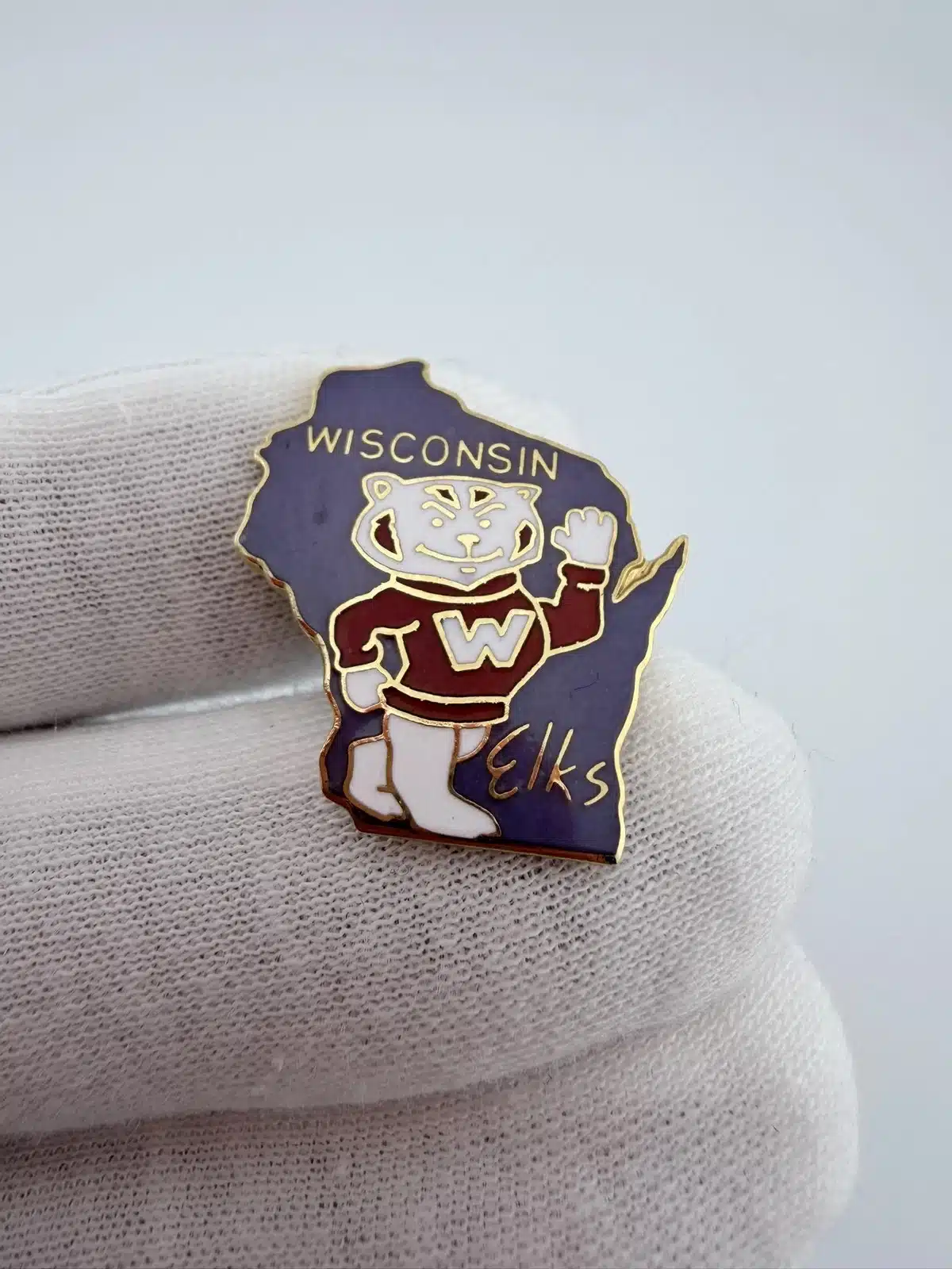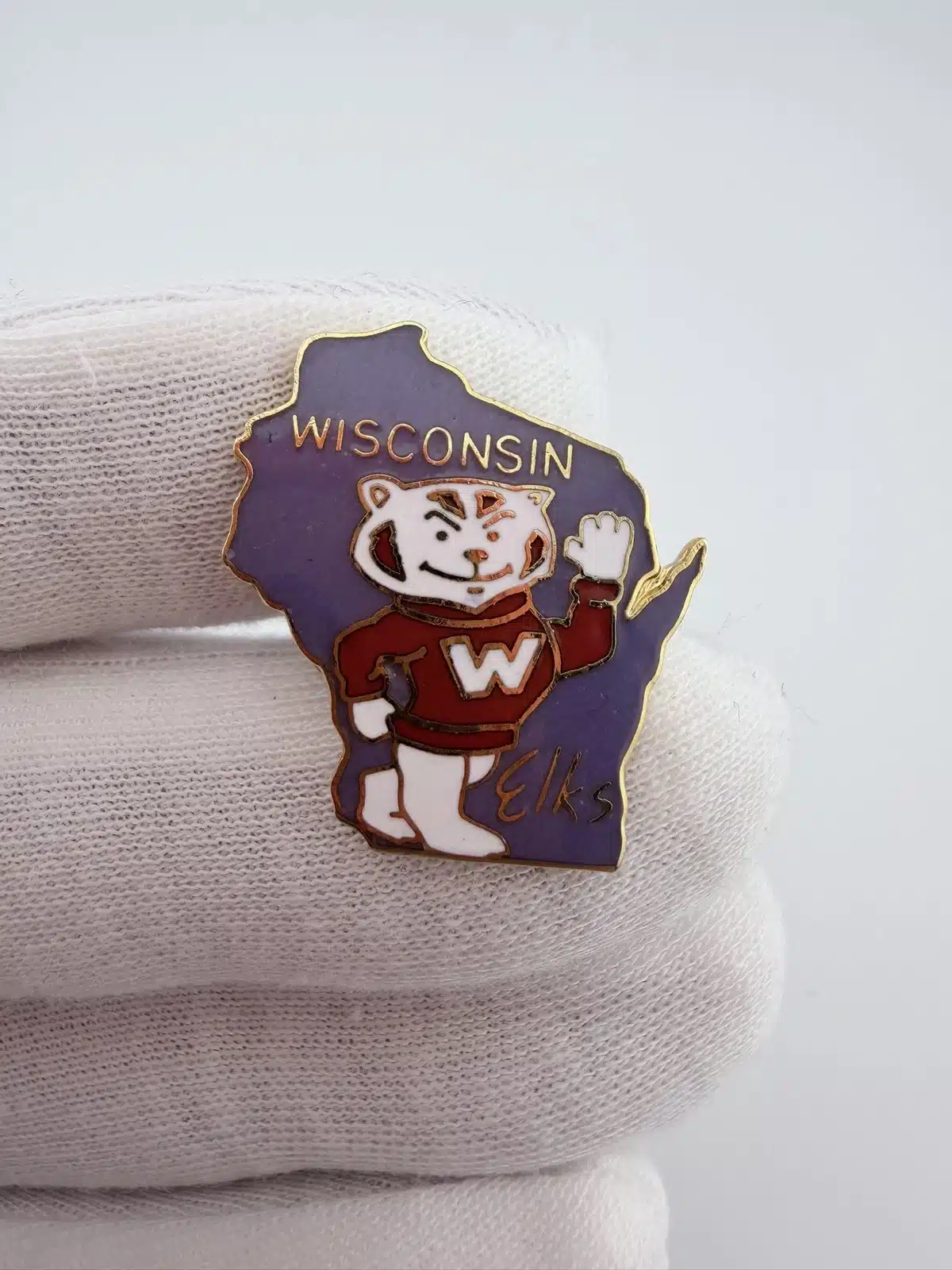 This pin features the outline of Wisconsin in purple, prominently displaying Bucky Badger, the University of Wisconsin-Madison’s mascot, waving cheerfully near the bottom of the state. The design incorporates the word “Elks,” referencing the Elks Lodge fraternal organization.