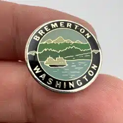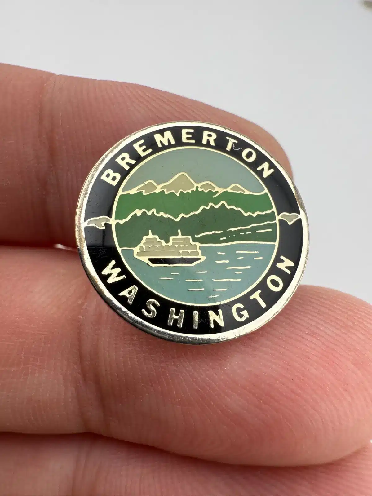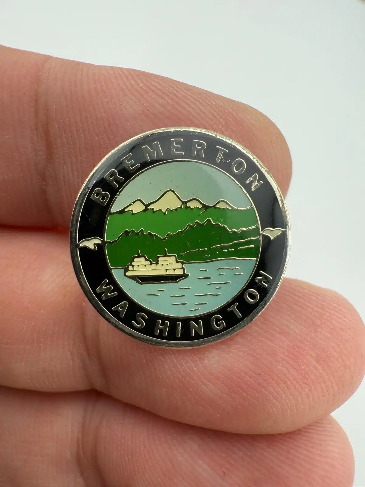 Bremerton is a city on the Kitsap Peninsula in Washington state, closely tied to naval operations and ferry service across Puget Sound, with views of the Olympic Mountains forming a prominent part of the local landscape. Pin measures 3/4 inch in diameter.