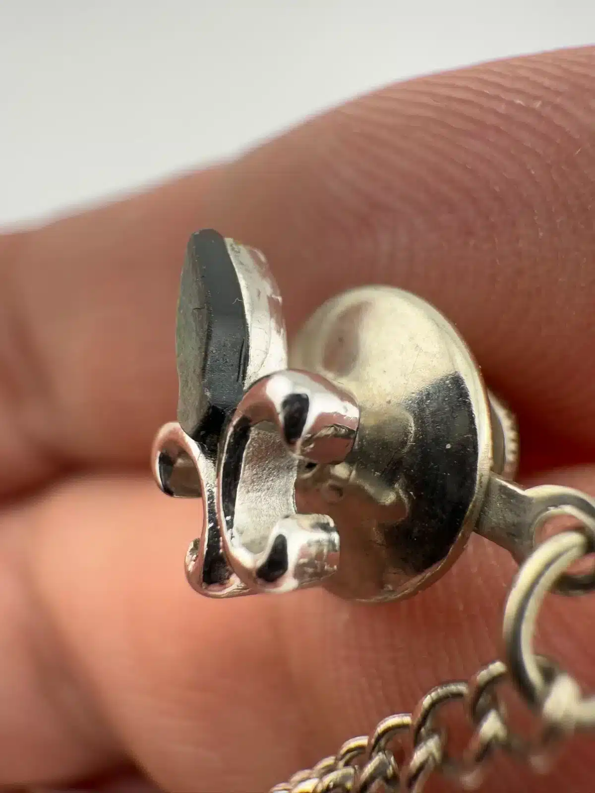 Used with marks. Not sure what the top layer is made out of. Similar pins have mother of pearl, so its possible this is black mother of pearl. Please see all photos for exact condition of item and size.