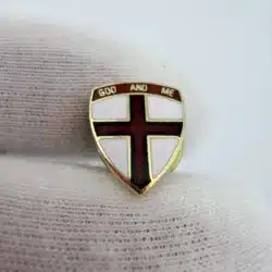 This small lapel pin features a red cross set within a shield design, representing the God and Me program of the Boy Scouts of America. The program is part of the organization’s broader religious emblem series and is designed to help youth explore their faith, strengthen their relationship with God, and build character through guided study and service.