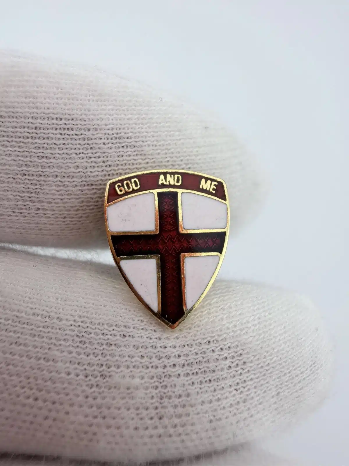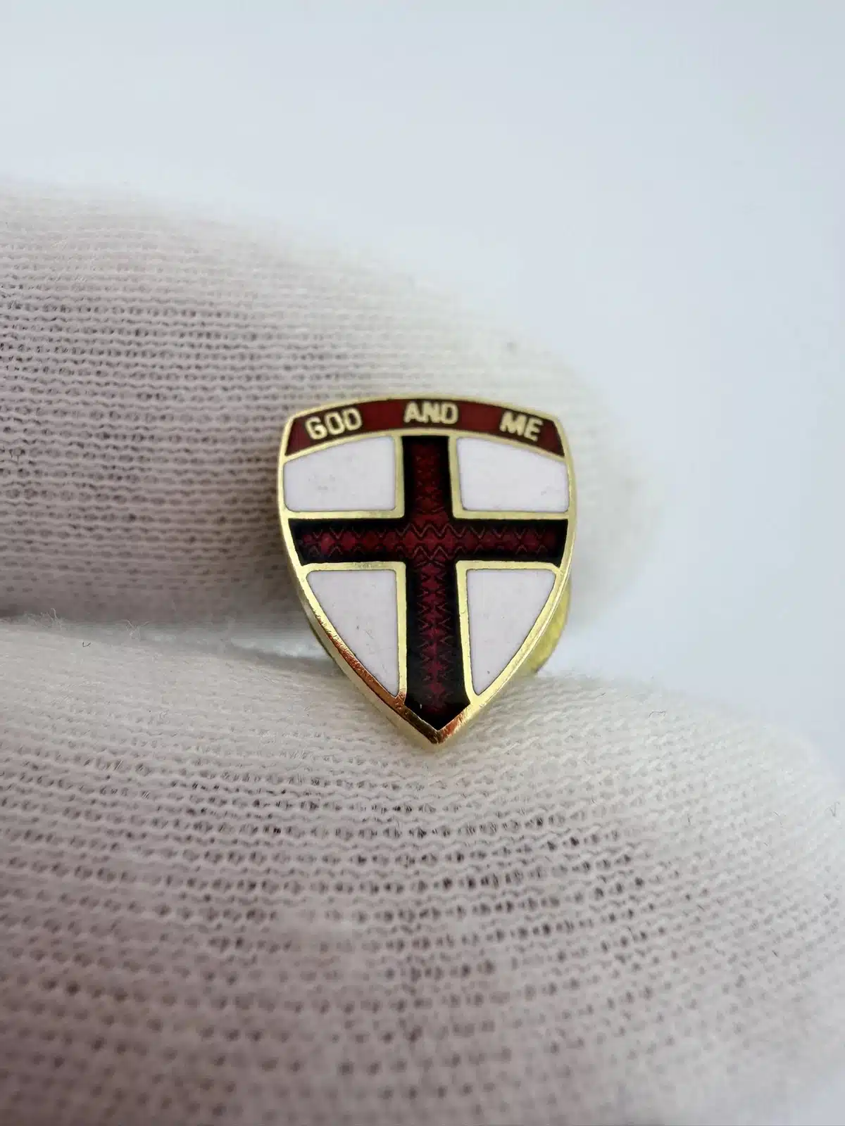 This small lapel pin features a red cross set within a shield design, representing the God and Me program of the Boy Scouts of America. The program is part of the organization’s broader religious emblem series and is designed to help youth explore their faith, strengthen their relationship with God, and build character through guided study and service.