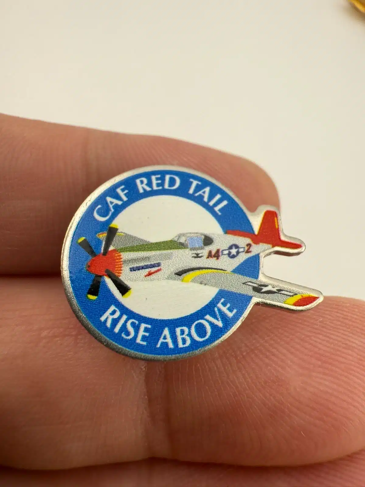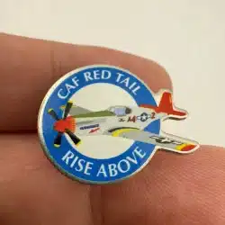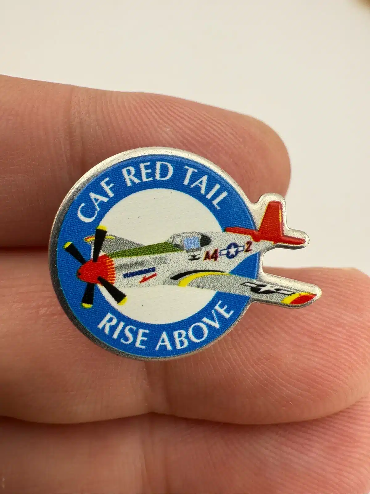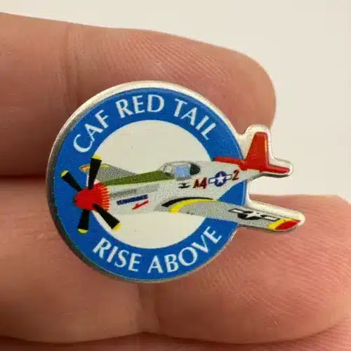 The Commemorative Air Force Red Tail Squadron honors the legacy of the Tuskegee Airmen, using the Rise Above program to educate and inspire through history and aviation. Pin measures approximately 1 inch in width by just over 1/2 inch in height.