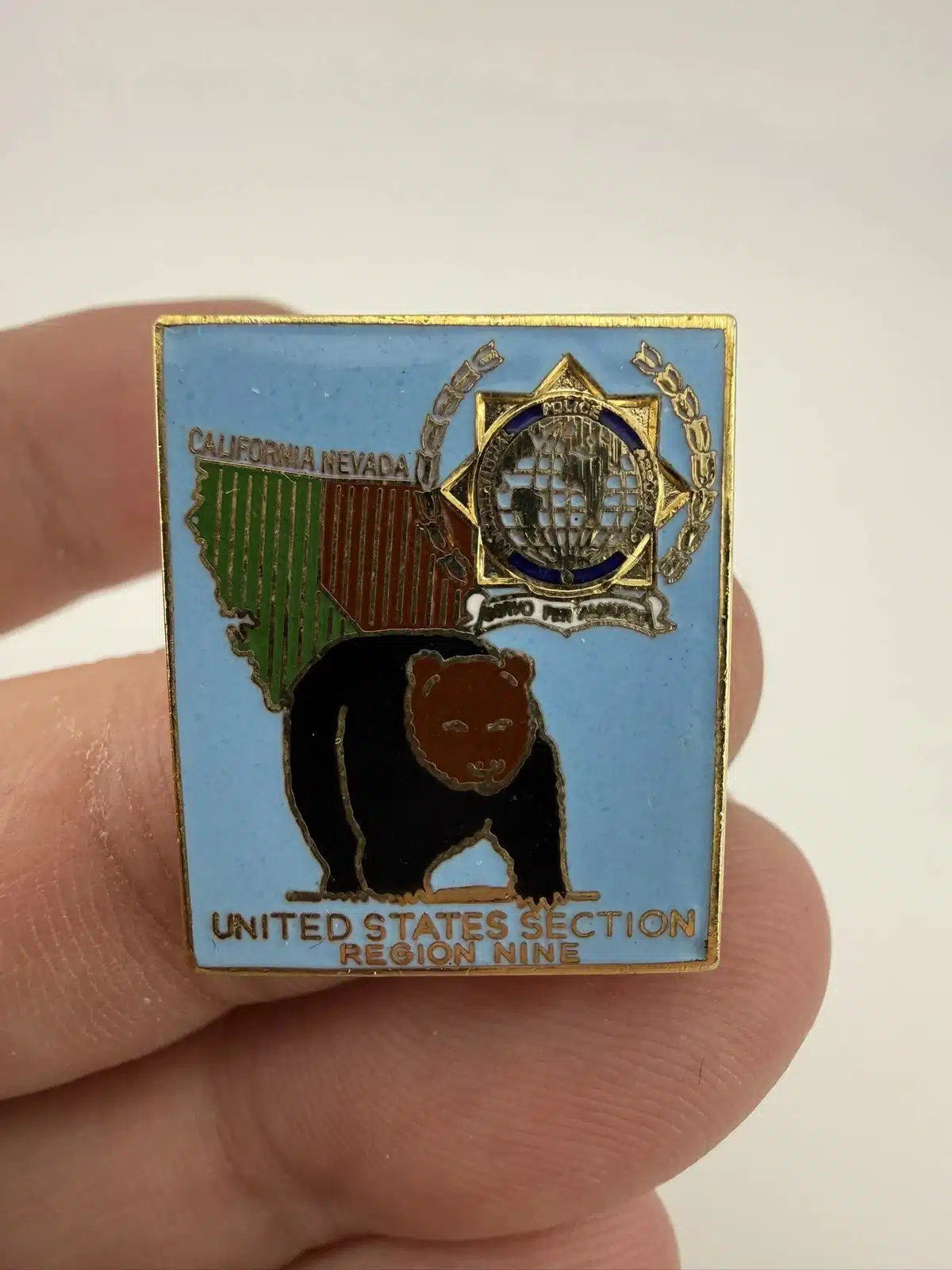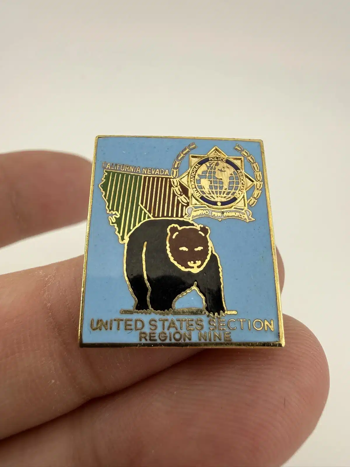 This pin showcases the International Police Association logo, prominently featuring the outlines of California and Nevada, symbolizing the unity of law enforcement across these states. A striking bear is depicted in the foreground, representing California’s state symbol and adding a distinctive element to this collectible piece.