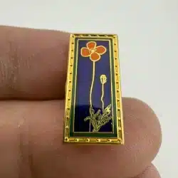 This exquisite California Poppy Flower Pin by Lucia features a vibrant depiction of the state flower, showcasing its iconic orange petals and green foliage. Created between 2005 and 2006, this piece captures the essence of California’s natural beauty and floral heritage.
