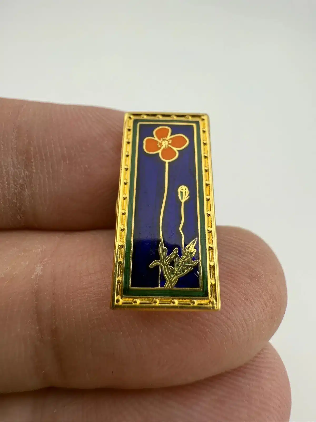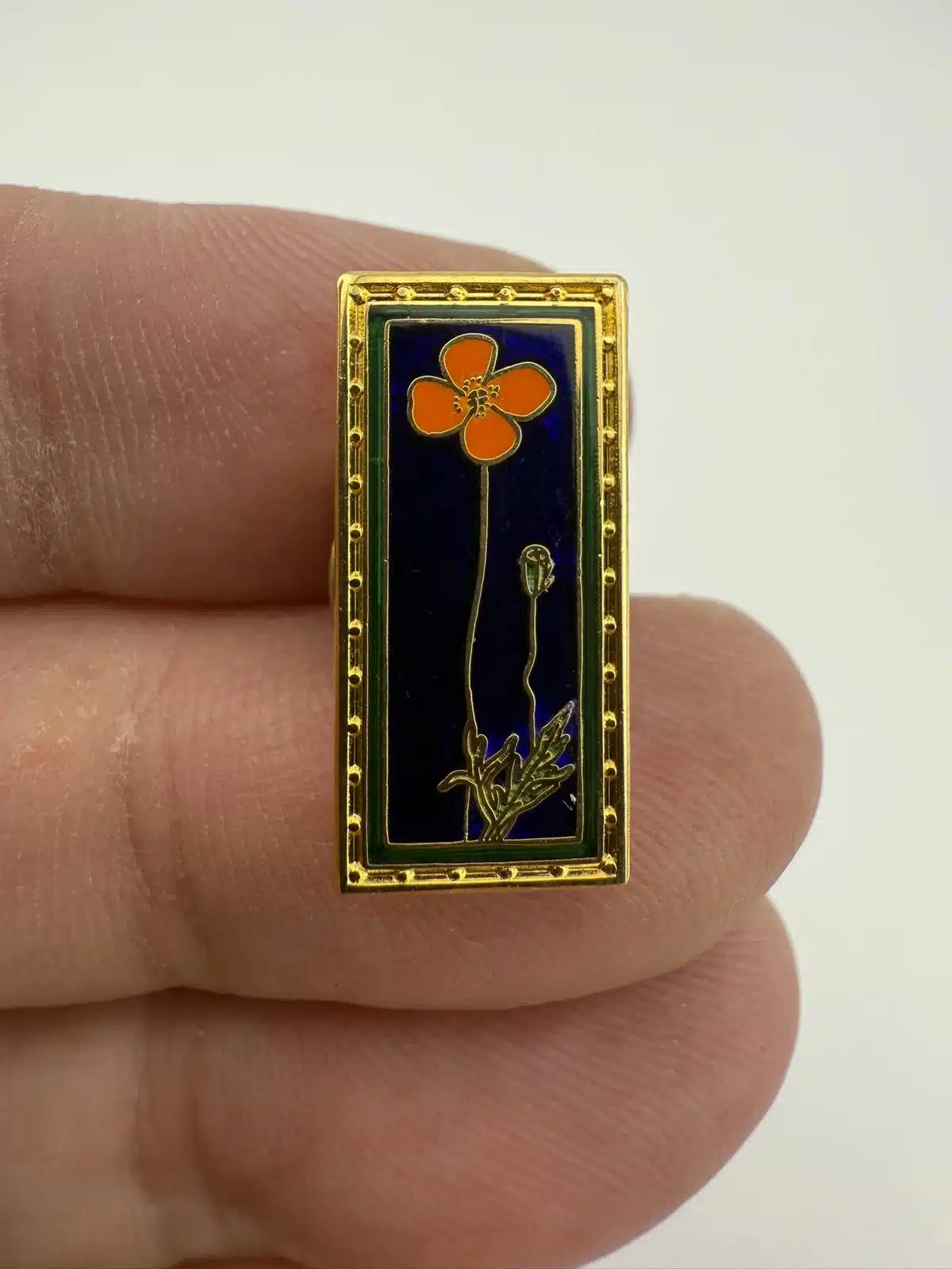 This exquisite California Poppy Flower Pin by Lucia features a vibrant depiction of the state flower, showcasing its iconic orange petals and green foliage. Created between 2005 and 2006, this piece captures the essence of California’s natural beauty and floral heritage.