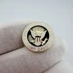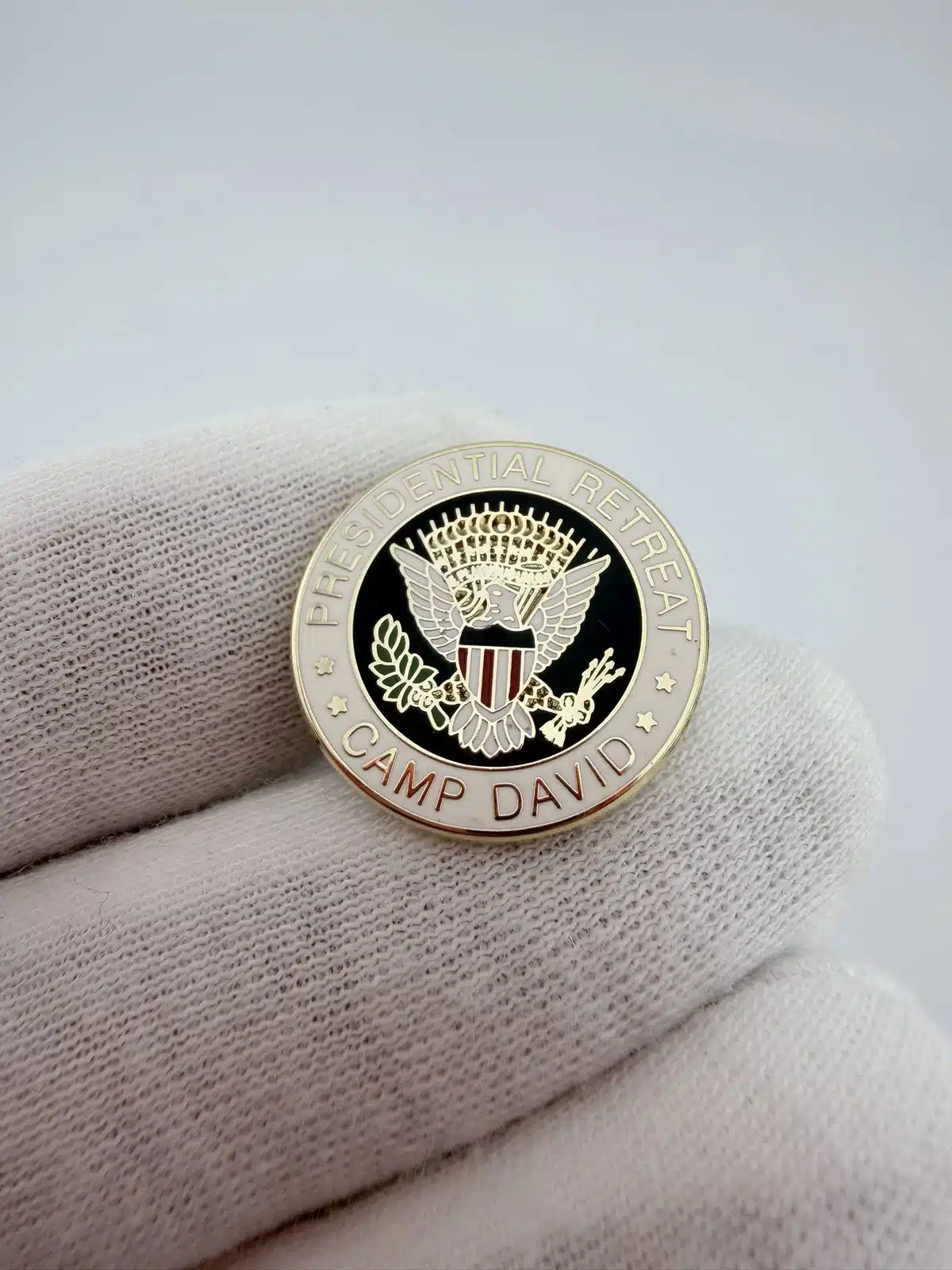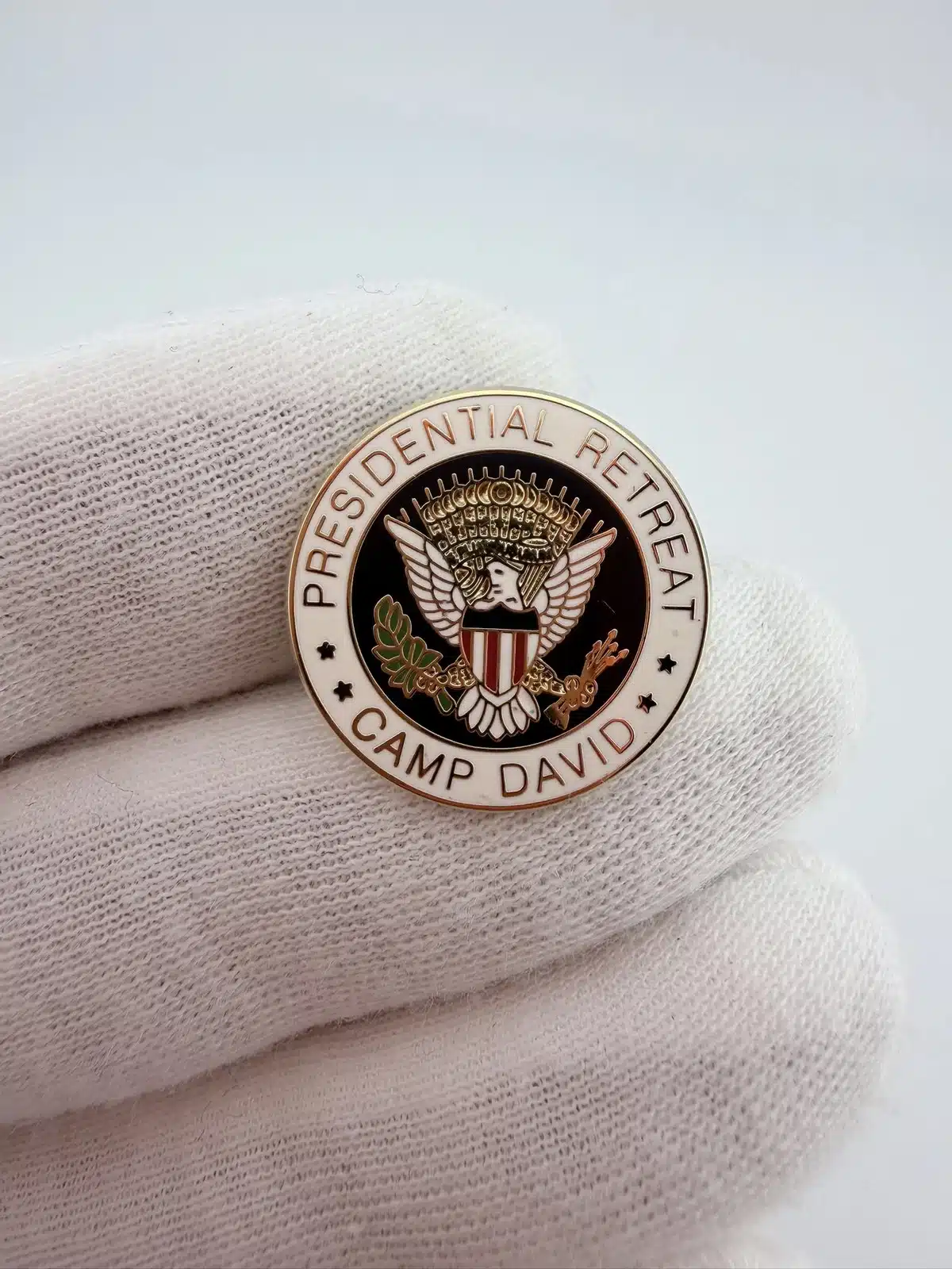 Rare Camp David Presidential Retreat lapel pin features a circular design with the Seal of the President of the United States at the center. Around the inner ring, the text reads “Presidential Retreat” at the top and “Camp David” along the bottom.
