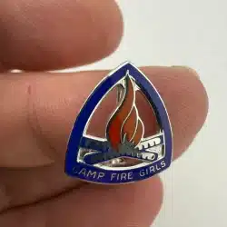 Produced by Balfour, a well-known manufacturer of school and organizational jewelry, this pin represents the Camp Fire Girls organization, one of the earliest youth groups in the United States focused on leadership and community involvement. Pin measures approximately 5/8 inch in width by just under 3/4 inch in height.