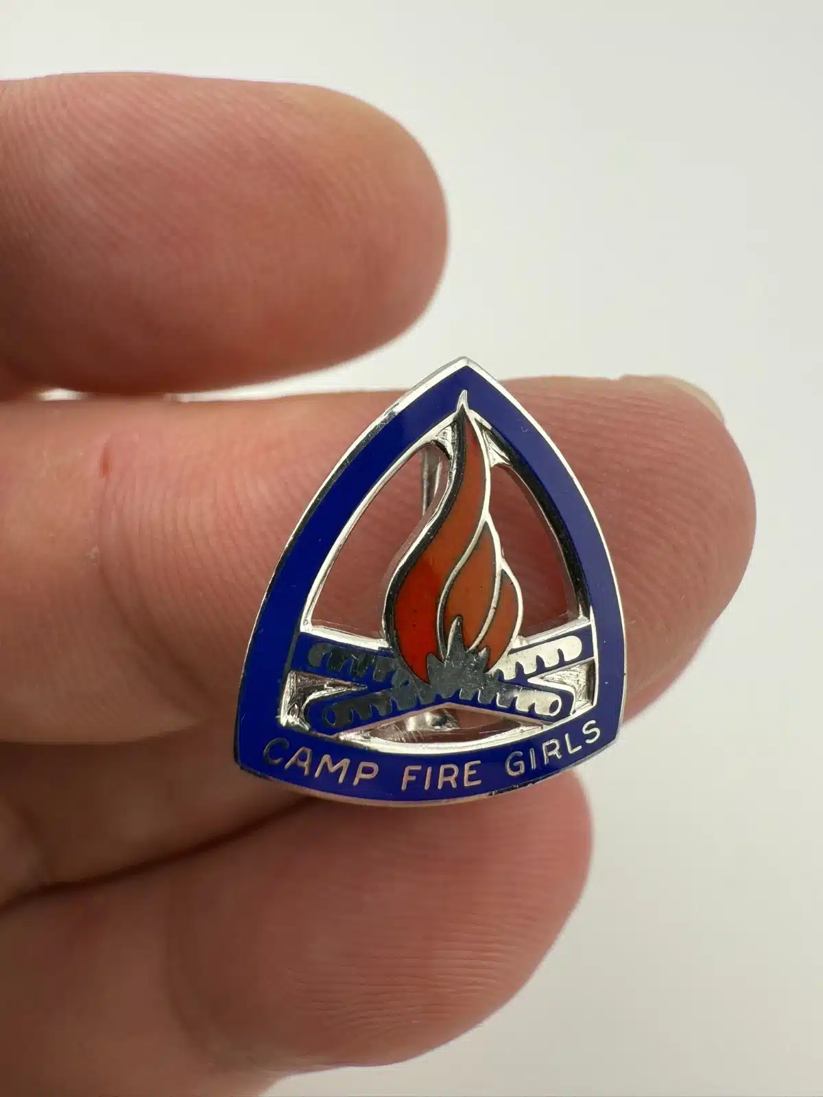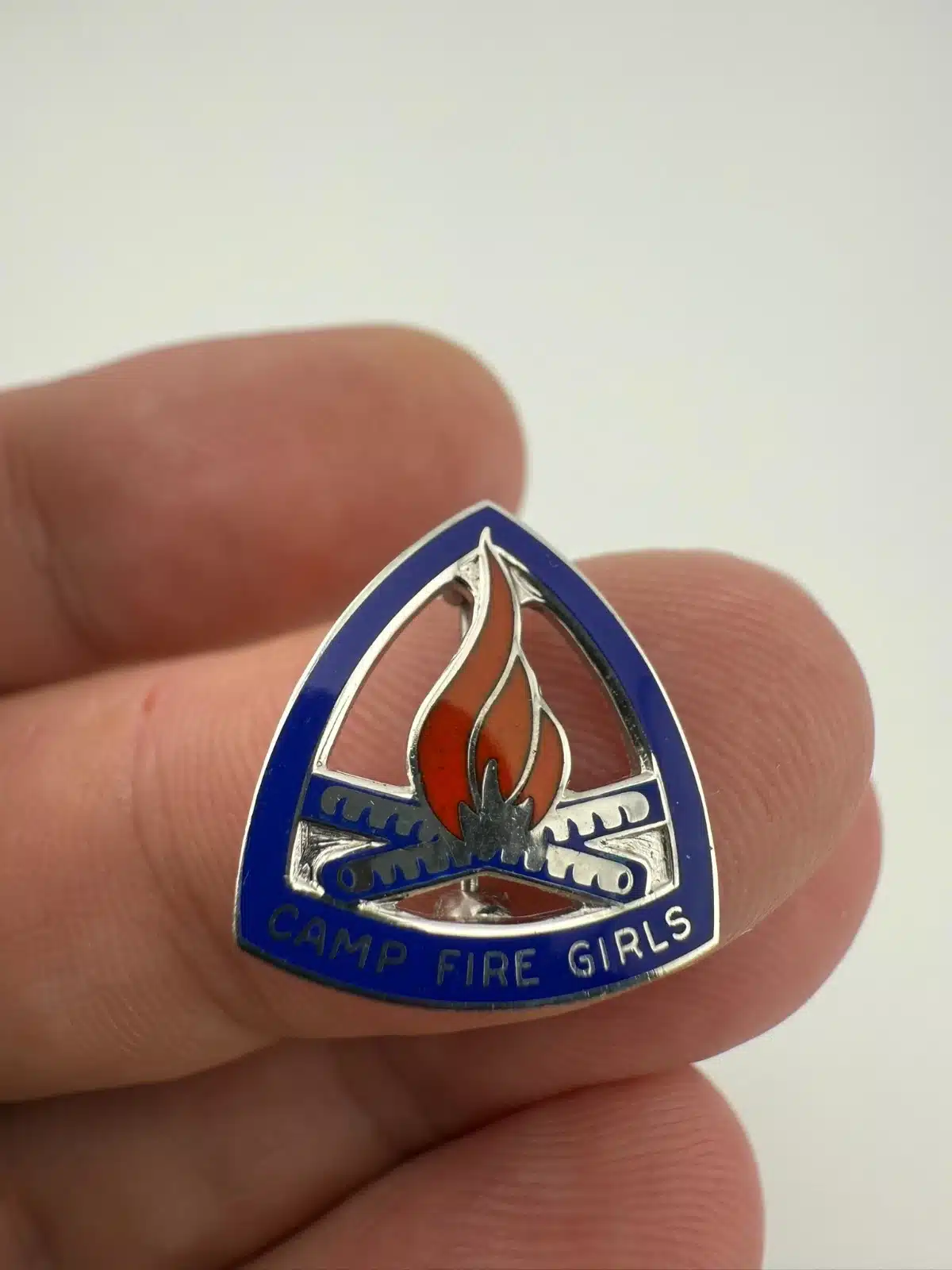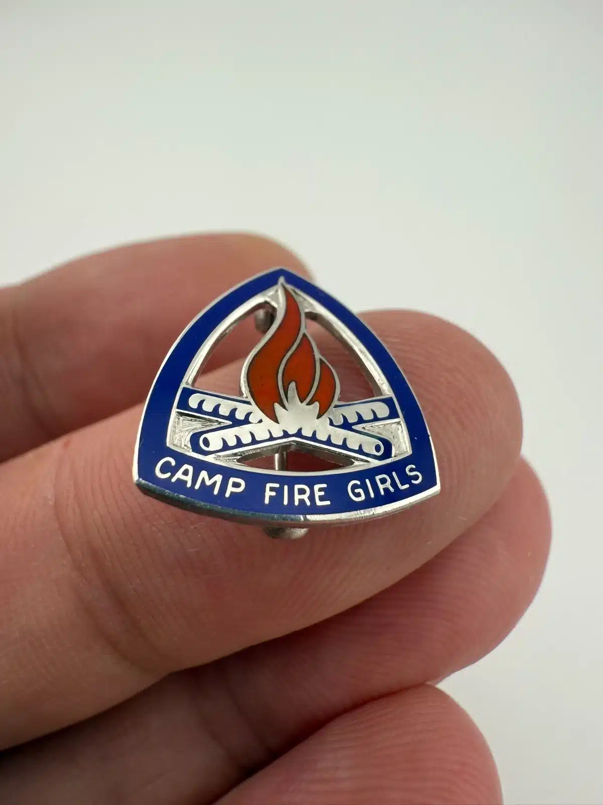 Produced by Balfour, a well-known manufacturer of school and organizational jewelry, this pin represents the Camp Fire Girls organization, one of the earliest youth groups in the United States focused on leadership and community involvement. Pin measures approximately 5/8 inch in width by just under 3/4 inch in height.