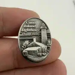This lapel hat pin features the iconic Cana Island Lighthouse in silver tone, a historic beacon located in Door County, Wisconsin, known for its striking white tower and red roof. The design captures the lighthouse’s distinctive silhouette against a backdrop that reflects the natural beauty of the surrounding area.